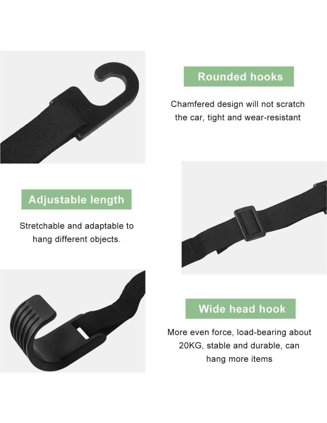 Especificación: Material: Plástico Cantidad: 2/4 PCS Color: Negro Peso: 64 g (2.29 onzas) Tamaño: 11.2 x 1.4 pulgadas (28.4 x 3.6 cm) Tamaño Máximo de Ajuste: 15.7 x 1.4 pulgadas (39.9 x 3.6 cm) Característica: Ajustable, Práctico, Robusto Tipo de Ajuste: Ajuste Universal ¿Cuáles son las características de los ganchos para reposacabezas de asiento de auto? -Los ganchos ensanchados en la parte inferior te permiten colgar más cosas. -Los bordes suaves de las correas tejidas no rayarán tu asiento de auto. -El gancho para auto tiene una pequeña abertura para evitar que se caiga y se ajusta perfectamente a la barra del reposacabezas. -El gancho para asiento facilita el acceso a los artículos que deseas en momentos de urgencia.