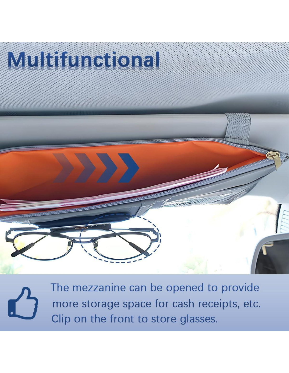 - Organizador Todo en Uno: El organizador de visera de coche aumenta efectivamente el espacio de almacenamiento dentro del vehículo. Tiene 4 bolsillos para tarjetas para almacenar varias tarjetas y documentos. Un bolsillo de malla es adecuado para almacenar boletos o licencias. Un soporte para gafas de sol con un diseño de botón de metal permite un acceso fácil. También hay un gran compartimento con cierre para almacenar efectivo, teléfonos, etc. El diseño de doble cierre proporciona espacio de almacenamiento adicional cuando se abre el bolsillo interior, sosteniendo varios artículos.
