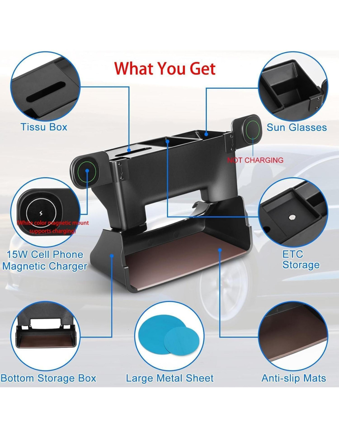 - [Cargador Inalámbrico Magnético Rápido de 15W Removible] Nuestra caja de almacenamiento de consola central para Tesla viene con 2 soportes magnéticos para tu teléfono celular. Solo el lado izquierdo del soporte magnético tiene la función de carga. A la izquierda está el potente Cargador Rápido de 15 Vatios que asegura una carga rápida y eficiente de tu teléfono. Adecuado para iPhone Pro Max Plus 15, 14, 13, 12, requiere un adaptador de cargador de coche QC 3.0 (no incluido) para carga rápida de 15W, 10W y 7.5W. Las pestañas metálicas incluidas son solo para una mejor atracción magnética y no se pueden usar para carga inalámbrica, de lo contrario, la carga no será posible. (El área magnética está cubierta con una película protectora que se puede quitar antes de usar)