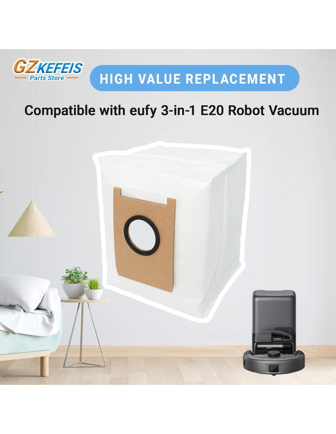 - 3. [Valor Duradero] Menos Cambios, Más Limpieza. La capacidad de 3L dura hasta 3 meses - Las bolsas de polvo de 5 paquetes diseñadas para eufy 3-en-1 E20 ofrecen un mantenimiento asequible de la aspiradora robot.