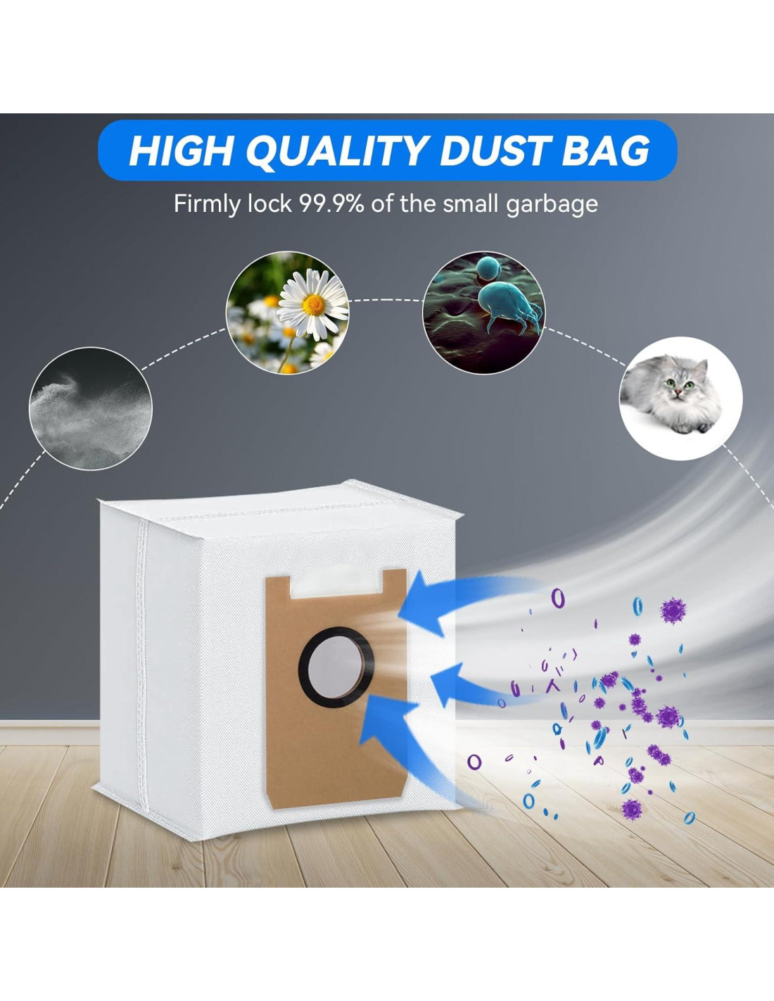 - Bolsas de polvo de aspiradora duraderas: Hechas de alta calidad, duraderas y de larga duración. 4 capas de tela y diseño de bordes bien sellados previenen que el polvo, los desechos, el cabello y otras partículas finas escapen mientras resisten pinchazos, desgarros y rasgaduras.