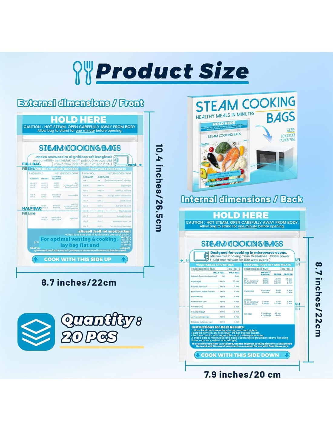 - Cocción Rápida y Conveniente: Sin pasos complicados y preparación tediosa, estas bolsas de vapor ahorrarán mucho tiempo y energía. Solo coloca la comida en la bolsa de almacenamiento y presiona la barra de sellado y luego cocina de acuerdo con las pautas de tiempo de cocción y señales de sugerencia en la bolsa.