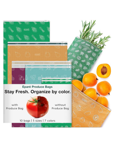 ¿QUÉ SUCEDE CUANDO COMPRAS UN PRODUCTO EPARÉ? ¡TU COCINA INMEDIATAMENTE OBTIENE UNA MEJORA! Te tenemos cubierto con nuestra amplia selección de accesorios únicos para el desayuno, la cena y todo lo demás. Empoderando a los anfitriones desde 2012. Estamos aquí para proporcionarte los productos que necesitas para convertir tu cocina en un lugar de alegría y conversación. Ofrecer productos versátiles y asequibles es parte de nuestra esencia, y no olvides nuestra promesa de calidad de por vida y empaque elegante. Cada producto que obtienes de Eparé es una experiencia que te hará sonreír y te colocará en una liga con miles de anfitriones felices que vinieron antes que tú. Estas bolsas para productos están hechas de una película de laminado de PP segura para alimentos, que puede ser reciclada. Este material innovador libre de BPA le da a estas bolsas una ventaja sobre las de algodón de malla. Son menos propensas a rasgarse o degradarse antes de su tiempo. Son libres de plomo y completamente seguras para alimentos y ayudan al planeta al reemplazar hasta 1,000 bolsas de plástico. ¡Olvídate de lidiar con esos molestos rollos de bolsas de plástico en la tienda! Lleva tus propias bolsas reutilizables para productos y consigue de manera eficiente todas las frutas y verduras que necesites para tu hogar. Mantén tus costosas frutas y verduras orgánicas frescas y crujientes desde la tienda de abarrotes hasta tu tabla de cortar semana tras semana. Estas resistentes y reutilizables bolsas de compras para productos se limpian rápida y fácilmente. No absorben olores como lo hacen algunas bolsas. Simplemente lávalas a mano o ponlas en el lavavajillas. Están diseñadas para soportar largas estancias en el congelador también. Y, cuando están bien cerradas, también mantienen a los insectos fuera de los alimentos dejados a temperatura ambiente. Si bien estas bolsas de almacenamiento reutilizables para productos son excelentes para solteros y parejas, también son perfectas para familias en crecimiento. Toma todas las frutas y verduras saludables que necesites y prepáralas para su almacenamiento en el congelador. Eso hace que sea muy fácil sacar una bolsa de verduras lista para un rápido vapor. Económico y conveniente para familias ocupadas. La versión de Epare de la bolsa reutilizable para productos es buena para ti y para el planeta. Hecha de película de laminado de PP no tejido, está diseñada para reemplazar hasta 1,000 bolsas de plástico de la tienda. Se limpia fácilmente a mano o en el lavavajillas y es segura para el congelador. Vienen en colores únicos para facilitar la organización de tus productos, así como otros artículos del hogar. Son impermeables y se cierran de forma segura para mantener fuera a los insectos. Mejora tu juego de nutrición con estas fantásticas bolsas reutilizables. Estas bolsas vienen en seis colores únicos para facilitar la organización. Asigna cada bolsa a un tipo diferente de fruta o verdura y haz que sea simple adquirir todos los productos saludables de tu lista de compras. Perfectas para organizar juguetes de niños, artículos para mascotas y pequeñas prendas de vestir. Sabe de un vistazo qué hay dentro de cada bolsa.