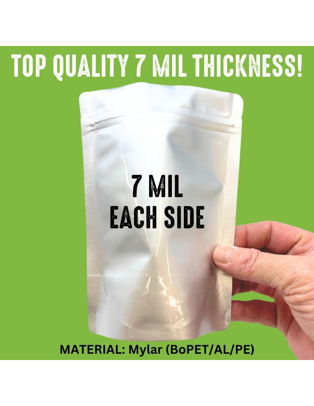- PROTECCIÓN MÁXIMA | Nuestras bolsas mylar son verdaderamente de 7 mil de grosor en cada lado, lo que crea durabilidad y aumenta la resistencia a perforaciones. Muchas empresas publicitan falsamente una bolsa de 7 mil, pero solo muestran 3.5 mil por lado.