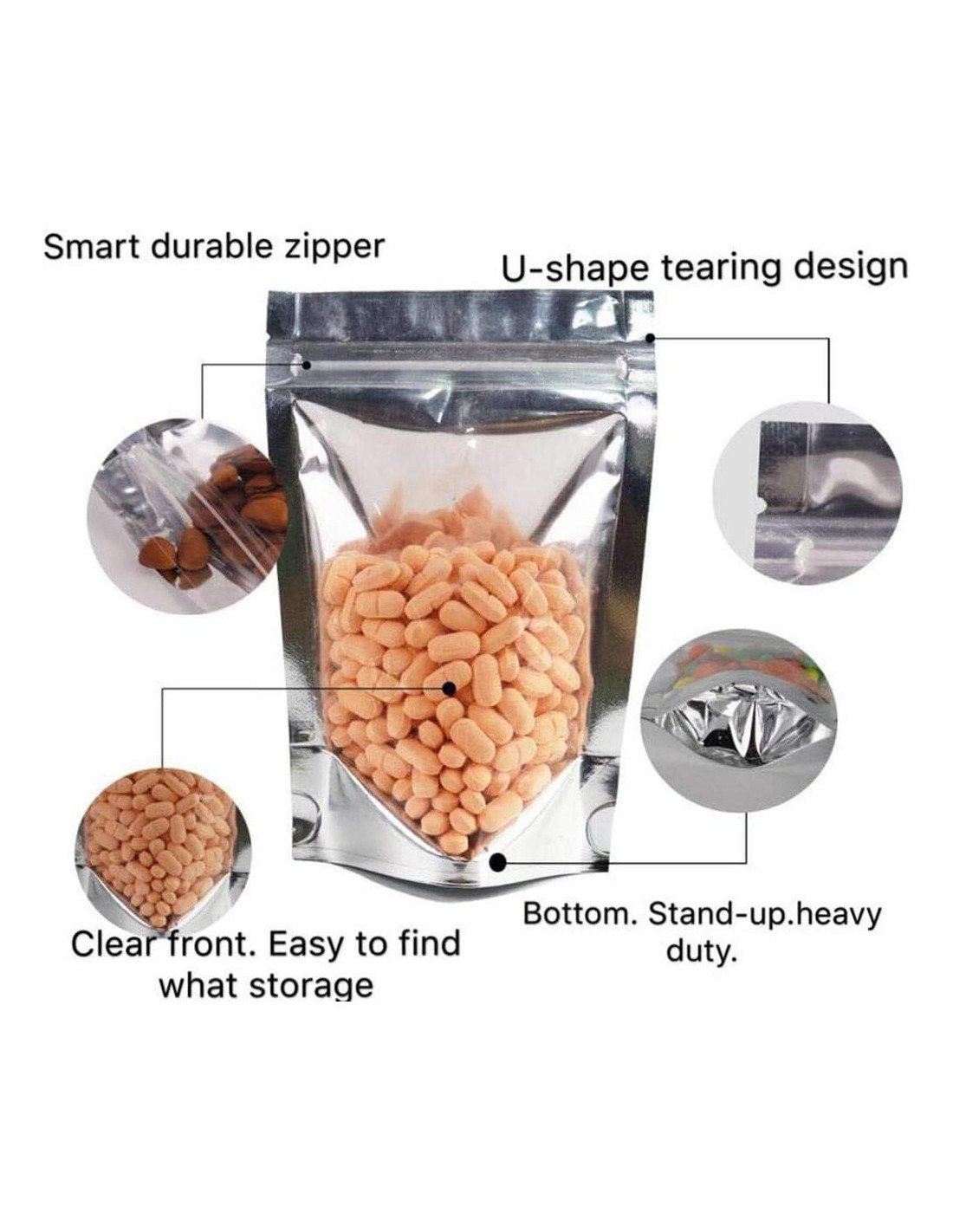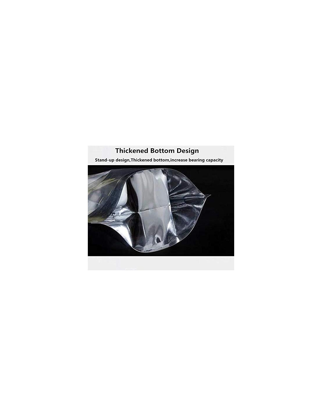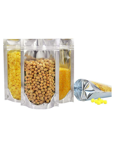 Mantén tus alimentos frescos y listos para comer con estas Bolsas Reutilizables Mylar con Cierre Ziplock. Tiene una abertura reutilizable y práctica que mantendrá tus alimentos frescos. Esta bolsa de alimentos reutilizable está disponible en una variedad de tamaños. Tiene un diseño de pie y está hecha con papel de aluminio plateado para un aspecto metálico. La bolsa ziplock Mylar es clara por un lado, por lo que puedes ver fácilmente los alimentos que guardas. ¿Por qué elegir nuestras bolsas de aluminio Mylar reutilizables a prueba de olores y resistentes para alimentos? Descripción: * Bolsa Mylar reutilizable a prueba de olores * 1 lado de las bolsas de alimentos Mylar es claro para una fácil visualización del contenido del paquete, el otro lado de papel de aluminio duradero es hermoso para exhibir. * Disponible en cantidades de 100 * Nuestras bolsas Mylar son más gruesas que muchas otras marcas. Especificación de 3.5*5+2.4 pulgadas * Ancho=3.5 pulgadas (8.89 cm), Largo=5 pulgadas (12.7 cm), Fondo=2.4 pulgadas (6.1 cm) * Color: Frente transparente claro, parte posterior de aluminio plateado. Paquete incluye: * 100pcs bolsas de pie con cremallera Mylar de alta calidad de 3.5*5+2.4 pulgadas