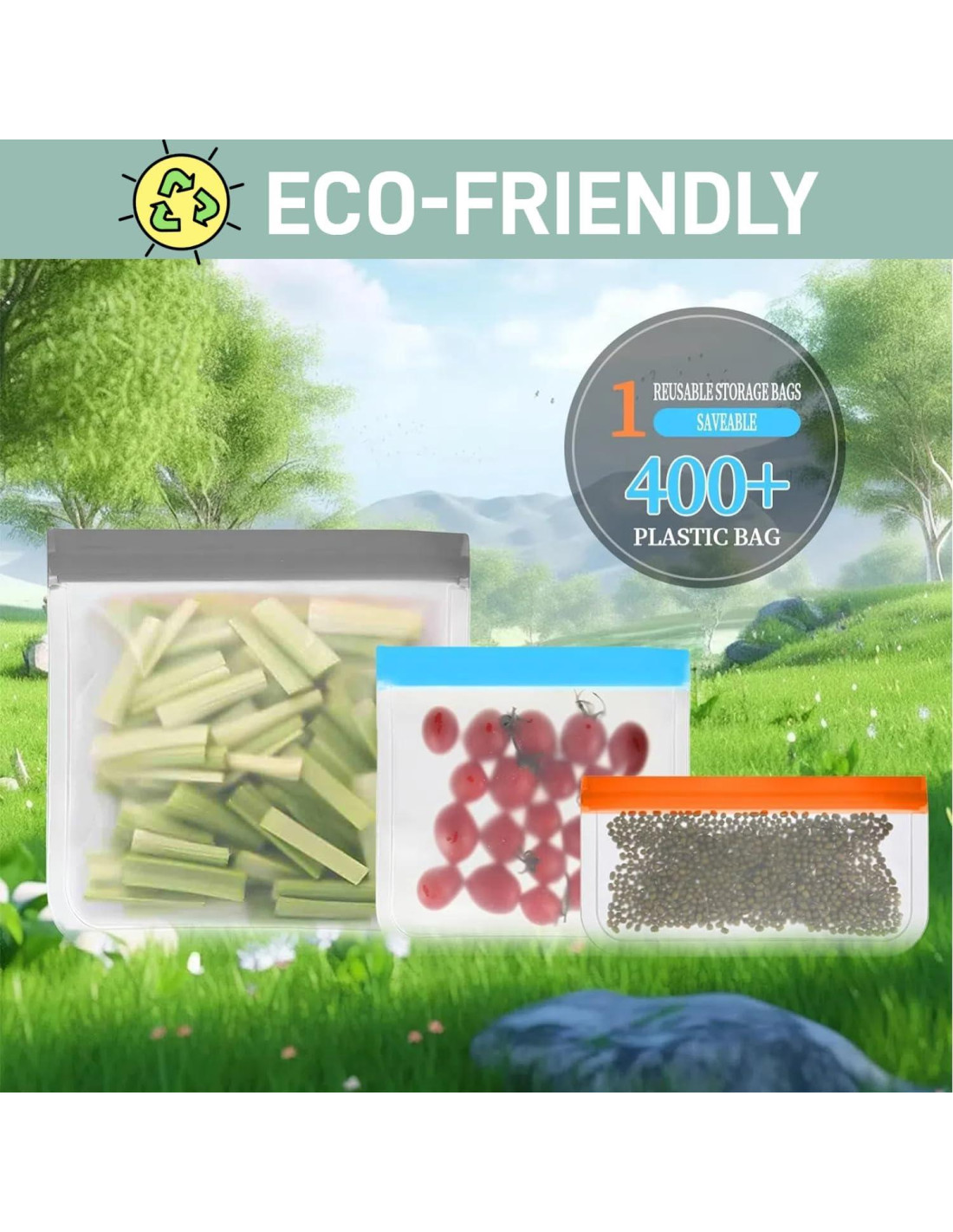 - Nos importa el medio ambiente, por eso nuestras bolsas de almacenamiento de alimentos de silicona son reutilizables y ecológicas. Hechas de material PEVA extra grueso y resistente, pueden reutilizarse cientos de veces, con solo una bolsa reemplazando más de 300 bolsas de plástico desechables.