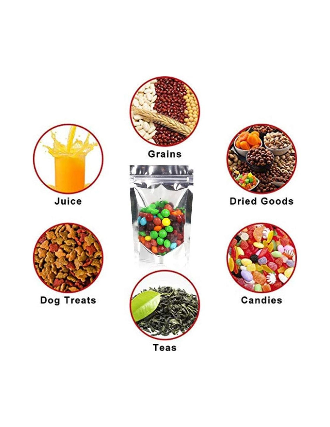 - Diseño de Alta Calidad y Práctico - Las bolsas mylar para almacenamiento de alimentos están hechas de PET + papel de aluminio, de alta calidad y duraderas. Las bolsas de celofán sellables pueden mantener tus productos limpios, reutilizables. El diseño - El frente es plástico transparente, exhibiendo el producto. La parte posterior es de papel de aluminio plateado holográfico, es un color brillante y hermoso - utilizado como bolsas de golosinas para fiestas.