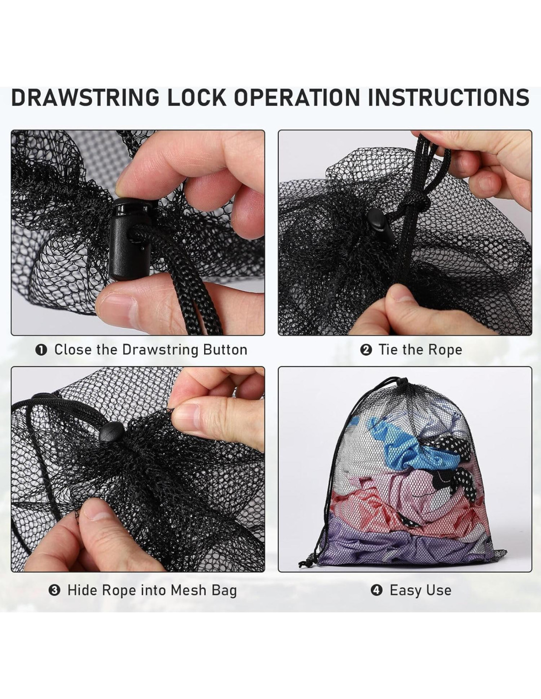 - Diseño de Cordón: Cada bolsa de malla con cierre de cordón cuenta con un cordón duradero con cierre de bloqueo deslizante, proporcionando un almacenamiento seguro que evita que los artículos se derramen. El diseño conveniente de la bolsa de malla facilita el transporte de artículos sin preocupaciones.