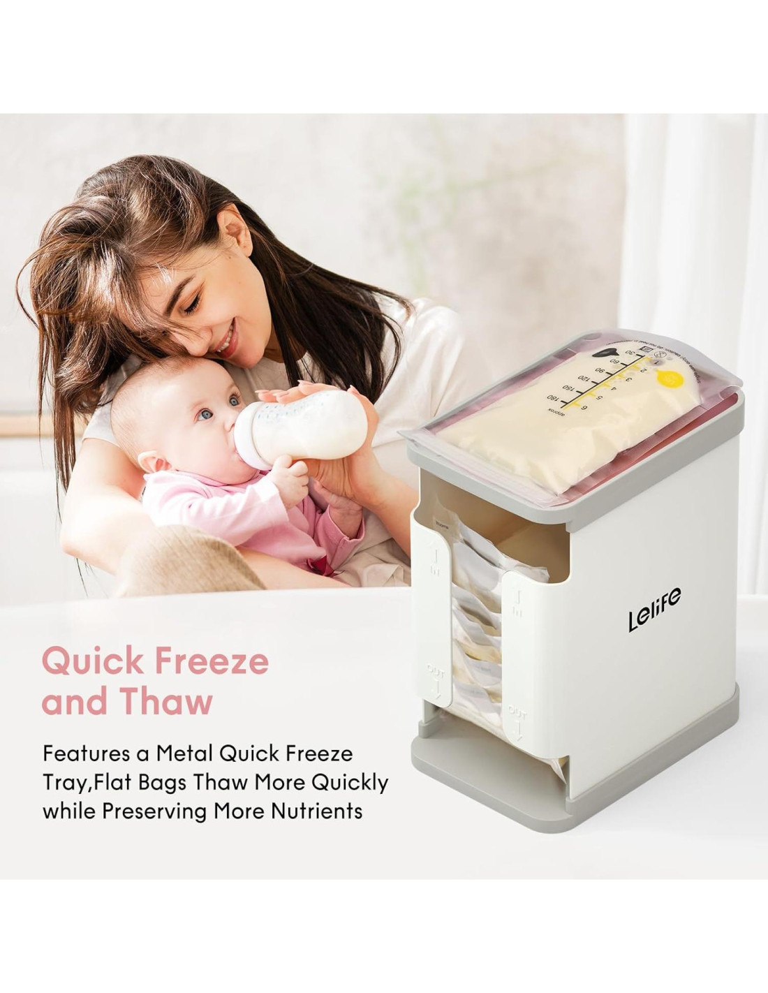 - Sistema Eficiente Primero en Entrar, Primero en Salir: El diseño de doble ranura (superior para agregar bolsas frescas, inferior para recuperar bolsas más antiguas) te ayuda a distinguir diferentes etapas de la leche y asegura que siempre obtengas el suministro más fresco.