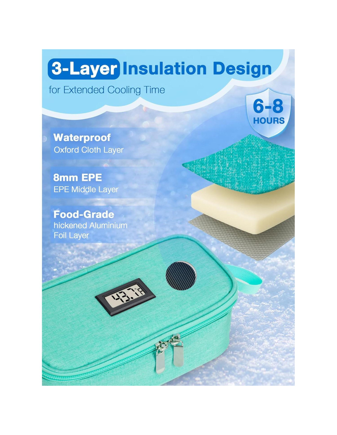 - Monitoreo de Temperatura en Tiempo Real - Equipado con un termómetro digital incorporado, esta bolsa de enfriamiento portátil para leche materna rastrea la temperatura interna en tiempo real, asegurando que la leche se mantenga dentro del rango seguro de almacenamiento. El diseño de alta aislamiento mantiene la leche materna fresca y proporciona tranquilidad para las mamás en movimiento