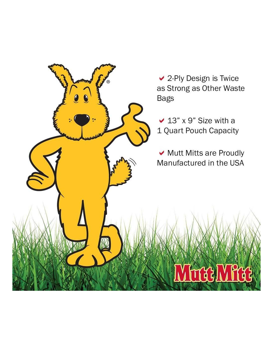 Este paquete contiene 100 Mutt Mitts de 2 capas grapados a una tarjeta colgante con una pestaña de volteo. Los Mutt Mitts están grapados a esta tarjeta de encabezado que permite colgar y una fácil extracción. Con Mutt Mitts recoger los desechos de las mascotas es tan simple como: ¡Agarrarlo, Girarlo y Tirarlo! Los Mutt Mitts tienen una construcción de 2 capas y un fondo espacioso, por lo que no tienes que tocar ni sentir las cosas desagradables. Los Mutt Mitts son completamente resistentes a perforaciones, por lo que girarlos al revés no ofrece estrés por el desorden. Los Mutt Mitts son más grandes que otras bolsas de desechos y pueden acomodar desechos de perros de todos los tamaños. ¡Solo un Mutt Mitt puede manejar una caja de arena completa también! Los Mutt Mitts deben usarse dentro de un año después de la compra.