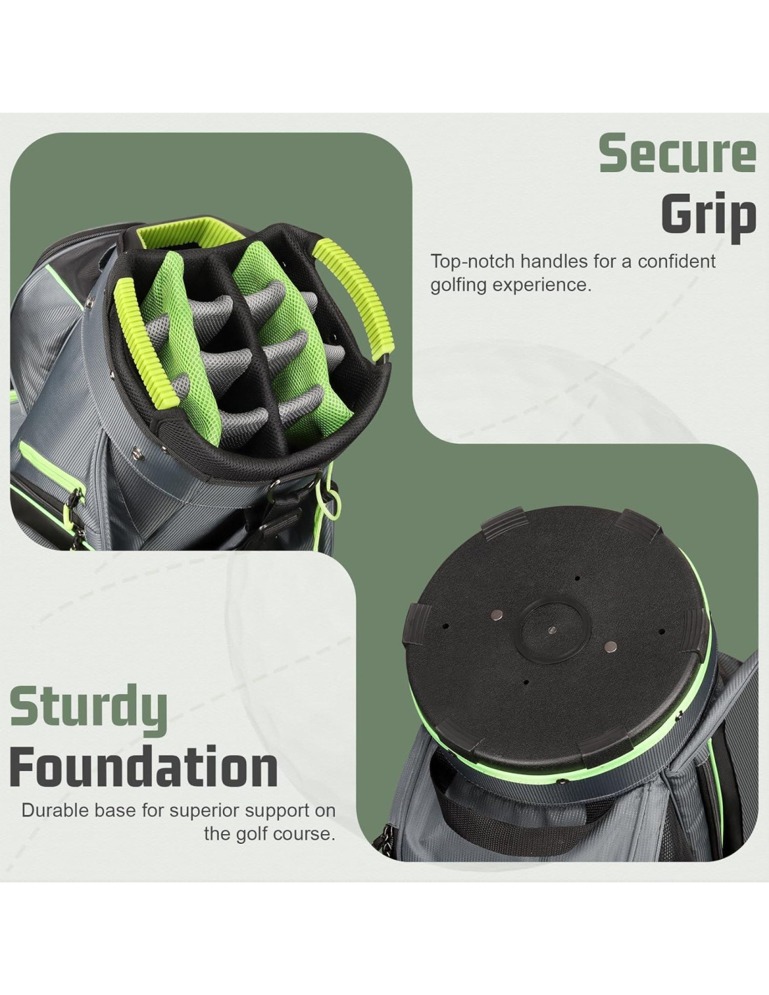 - Las bolsas de golf para carro para hombres están equipadas con una correa de hombro acolchada y ajustable para un transporte cómodo. Además, dos asas superiores proporcionan un agarre seguro para un fácil levantamiento y colocación en un carro de golf, permitiendo un movimiento y operación sin problemas en el campo.