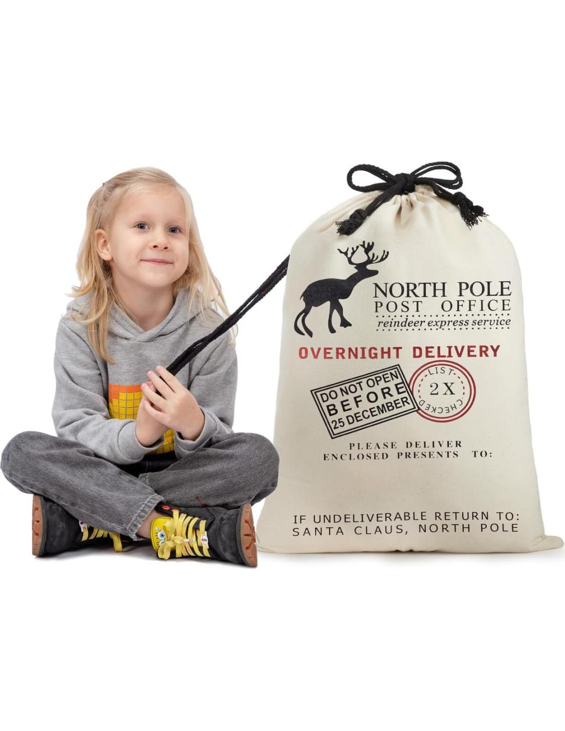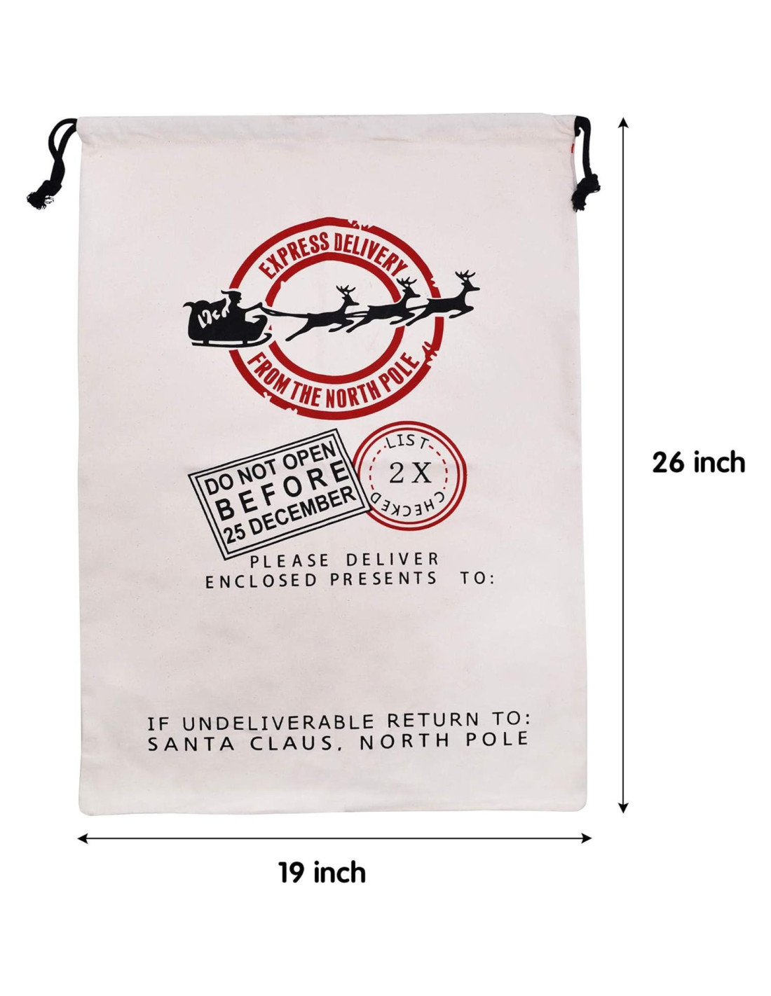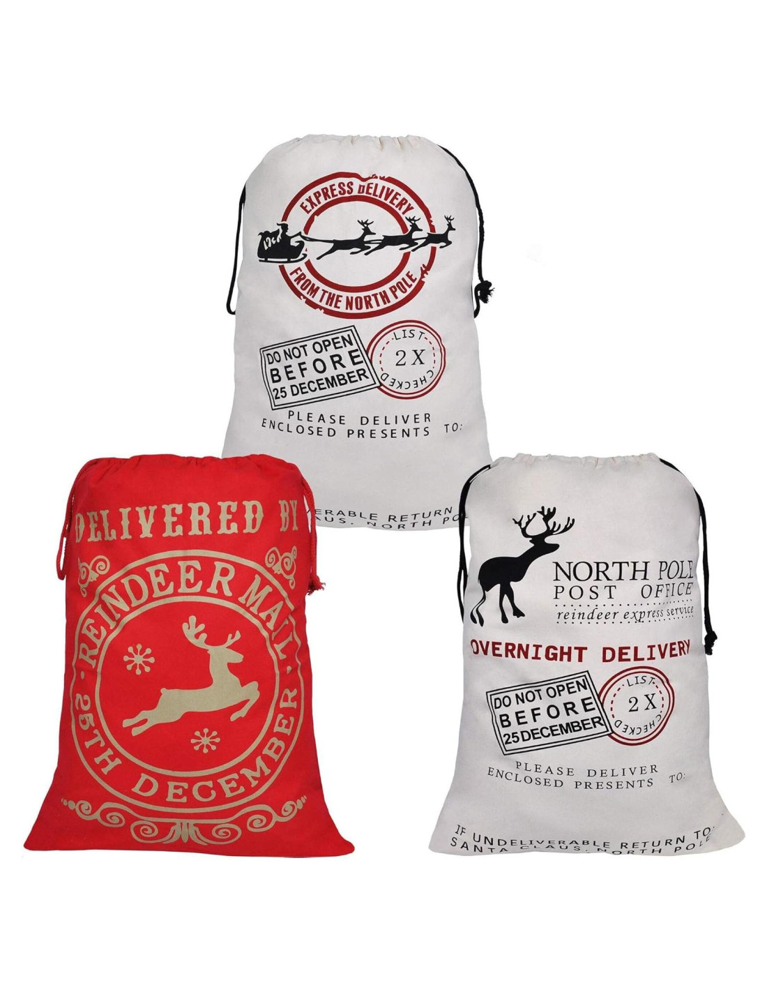 - PAQUETE DE SUPER VALOR. Las enormes bolsas de lona de Navidad incluyen 3 grandes sacos de Santa de 3 diseños diferentes. El diseño único y adorable incluye renos rojos con sello de correo, Santa en el trineo con renos, y la apariencia de la oficina de correos del polo norte. Tamaño: 66 cm x 48 cm