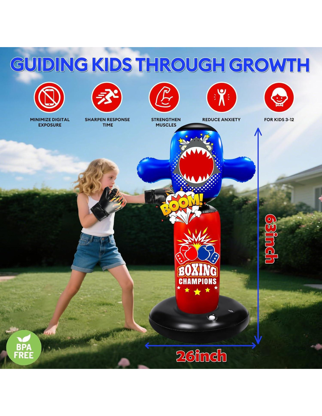 - [GRAN REGALO DE NAVIDAD/CUMPLEAÑOS PARA NIÑOS] ¿Buscas el regalo perfecto para tu hijo? ¡No busques más que el Saco de Boxeo Inflable Hyperzoo de 160 cm! Nuestro saco de boxeo es adecuado para niños de 5 a 12 años (hasta 1.57 m) y es adecuado para varios entrenamientos como boxeo, karate, taekwondo y más, proporcionando horas de diversión y promoviendo el vínculo entre padres e hijos. Ideal para la interacción familiar y el entretenimiento diario, ¡es un regalo que sigue dando!