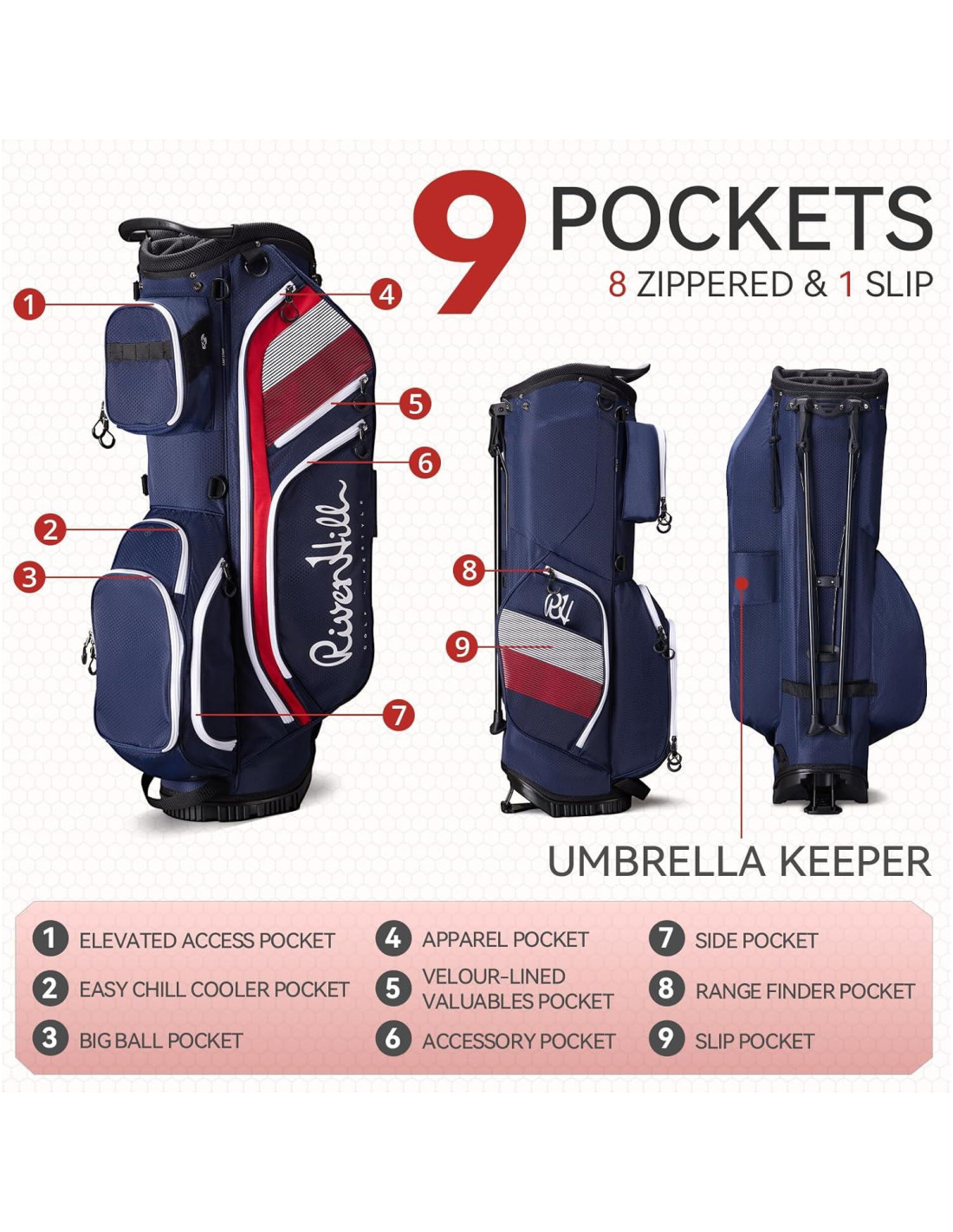 - 9 BOLSILLOS ESPACIOSOS, SOPORTE PARA PARAGUAS Y BOLSA DE ZAPATOS GRATIS: Mantente completamente preparado con 9 bolsillos diseñados inteligentemente en nuestra bolsa de golf, desde grandes compartimentos para ropa hasta bolsillos forrados para objetos de valor y un bolsillo enfriador aislado para mantener las bebidas frías. Un soporte dedicado para paraguas te mantiene listo para cualquier pronóstico.
