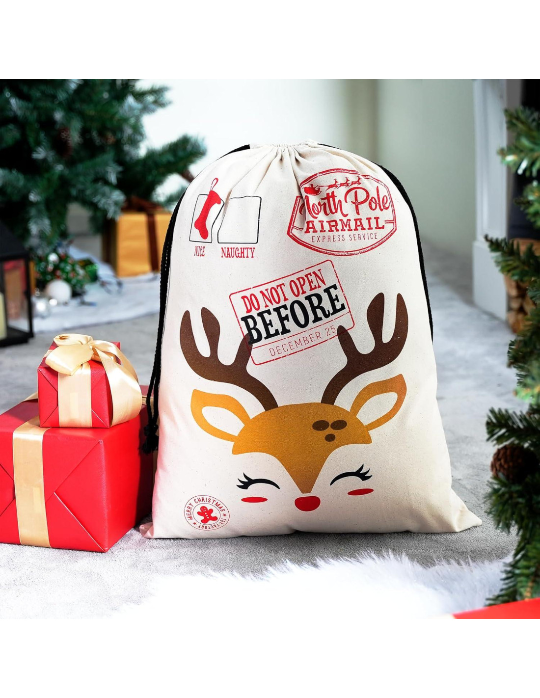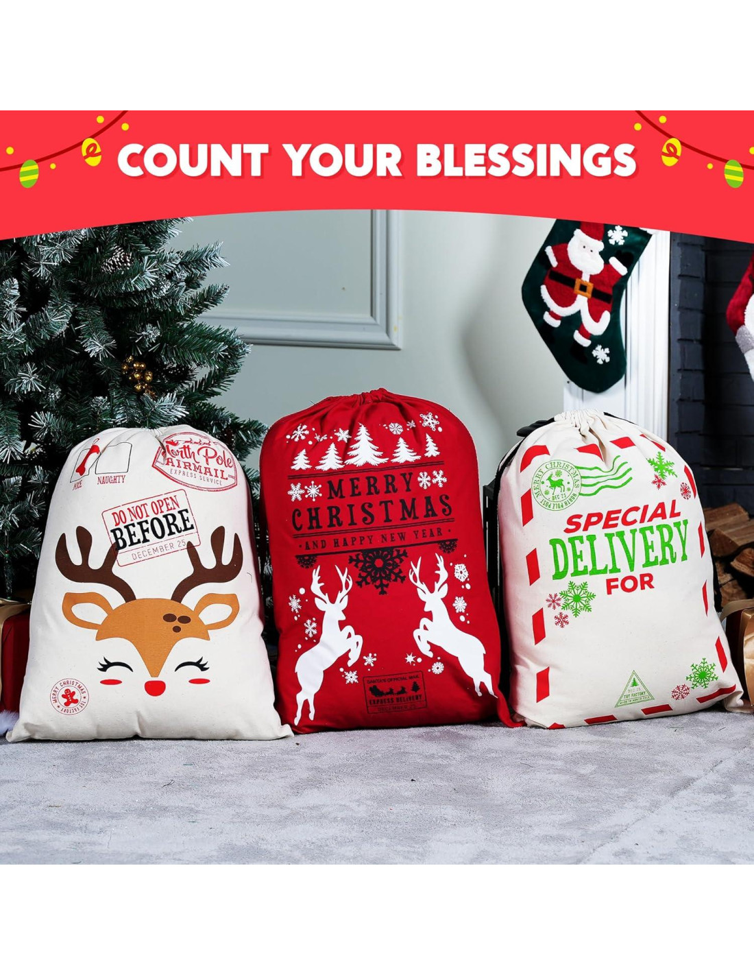 - PAQUETE DE SUPER VALOR. Nuestros Sacos de Santa de Navidad incluyen 3 sacos grandes de Santa de Navidad de 3 diseños diferentes con espacio para escribir deseos. El diseño único y adorable incluye. Tamaño: 66 cm x 48 cm