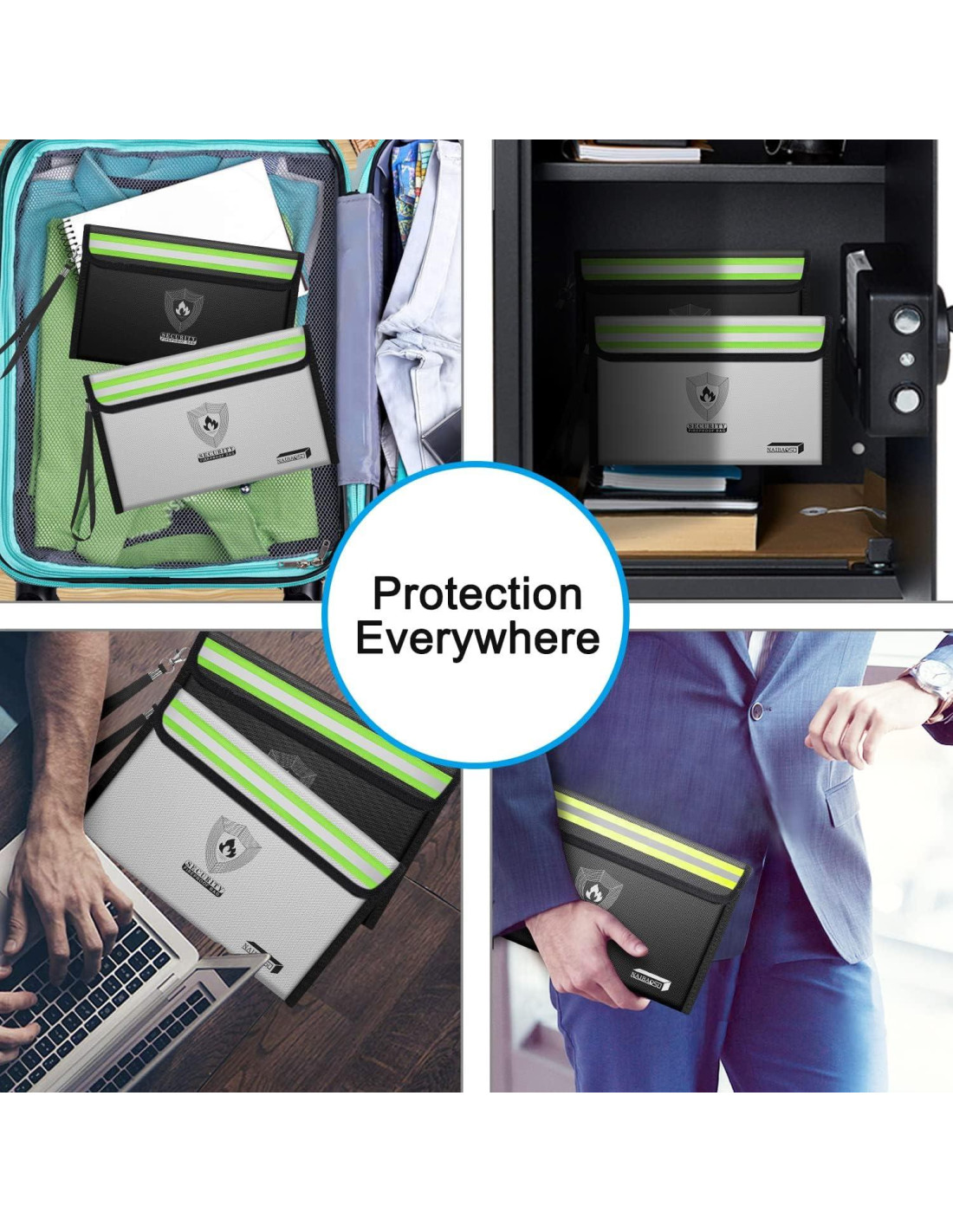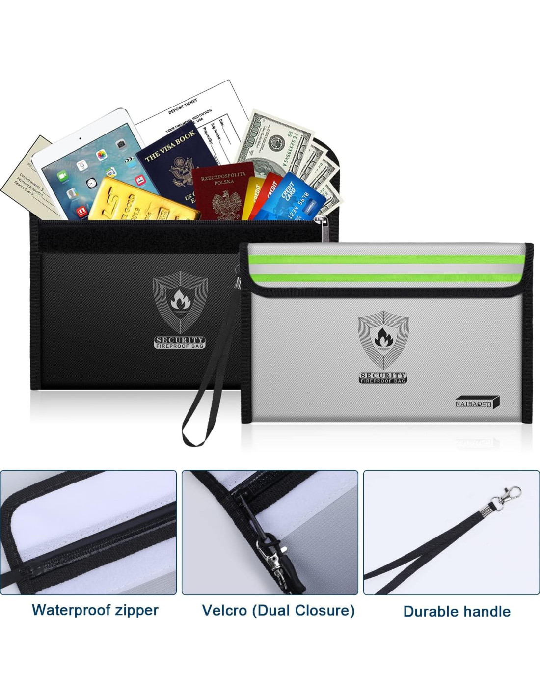 - Materiales Avanzados - Protección Total: Las bolsas de dinero a prueba de fuego mejoradas de NAIBAOSD están hechas de tres capas de fibra de vidrio retardante de fuego profesional y capas de aluminio a prueba de fuego que pueden soportar temperaturas de hasta 2000F (1093C). La capa de fibra de vidrio recubierta de silicona protege tus objetos de valor de daños por fuego. Proporciona protección profesional para tus objetos de valor, ya sea en casa, en la oficina, mientras viajas o en una emergencia.