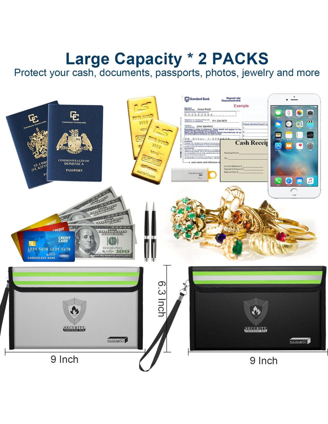 - Tamaño Estándar - 2 Bolsas: Estas dos bolsas a prueba de fuego miden 8.6*6.3 pulgadas (22*16cm). Te permite almacenar y organizar mejor tus muchos objetos de valor de pequeño tamaño. Puede ser especialmente utilizada para almacenar tu efectivo, pasaporte, tarjetas, certificados, joyas, llaves, fotos y otros artículos.