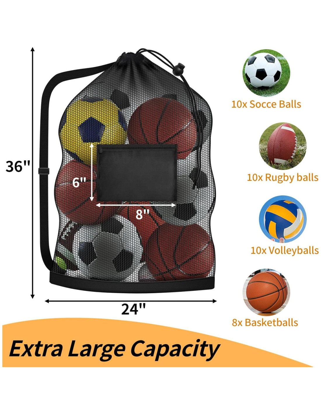 - Capacidad Extra Grande: La bolsa de baloncesto medida en 61 cm x 91 cm puede contener hasta 8 balones de baloncesto, 10 balones de fútbol (tamaño 5), 10 balones de rugby, voleibol o fútbol; puedes llevar todos tus balones y equipo de entrenamiento en una sola bolsa