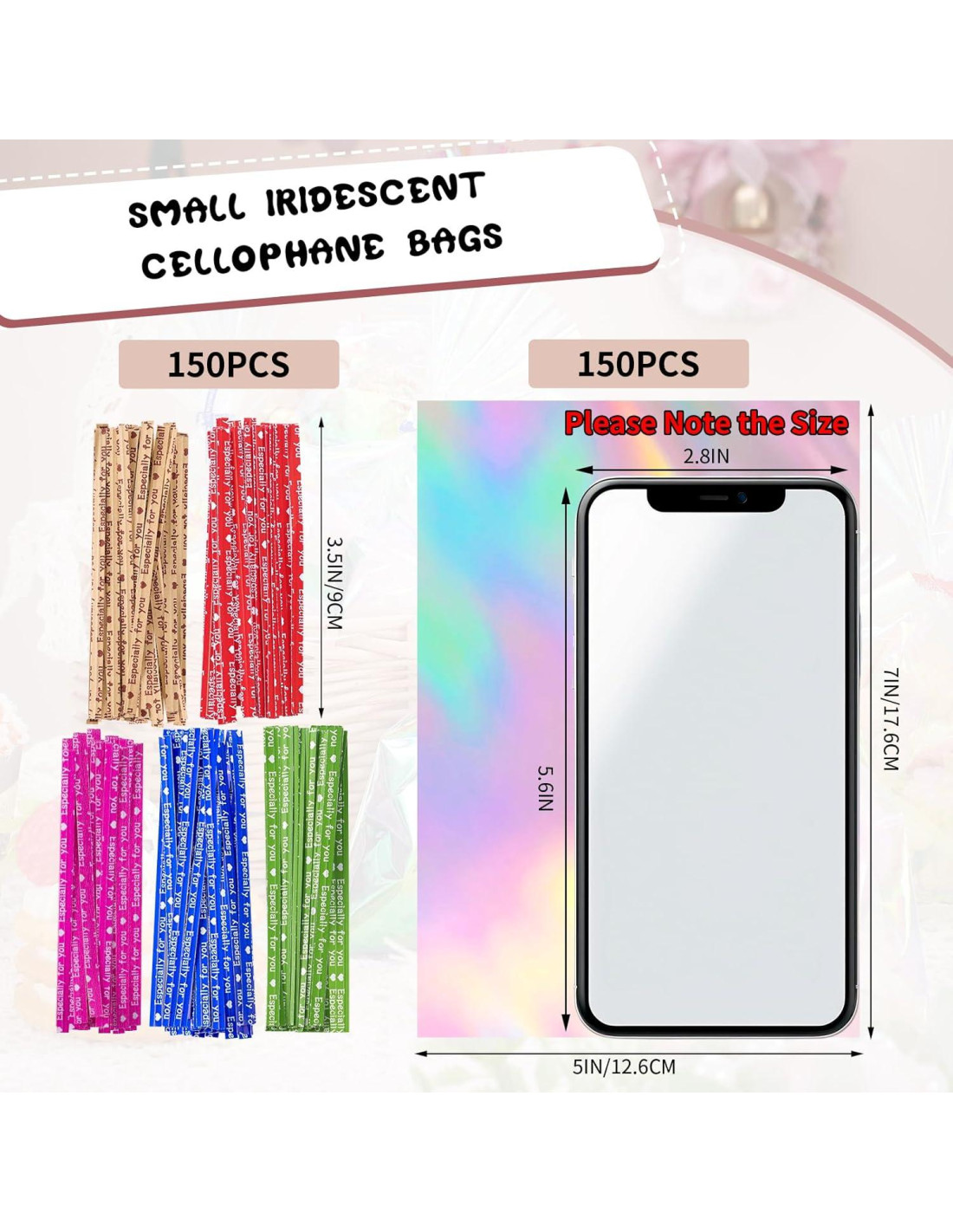 - [Razones para Comprar] Hemos aumentado el tamaño de las bolsas de celofán iridiscentes, 5*7 pulgadas (12.7x17.8 cm) es adecuado para nosotros, con un hermoso diseño holográfico de arcoíris, aumentamos la cantidad a 150, y cuidadosamente preparamos 150 cierres de torsión de 5 colores.