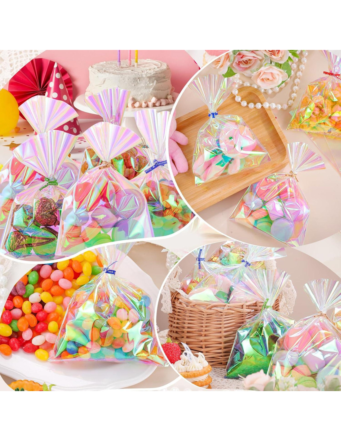 - [Múltiples Ocasiones] Las bolsas de trato de celofán iridiscentes con cierres son adecuadas para fiestas, baby showers, cumpleaños, regalos de negocios, bodas, Día de San Valentín, Día de la Madre, Pascua y otras festividades importantes.