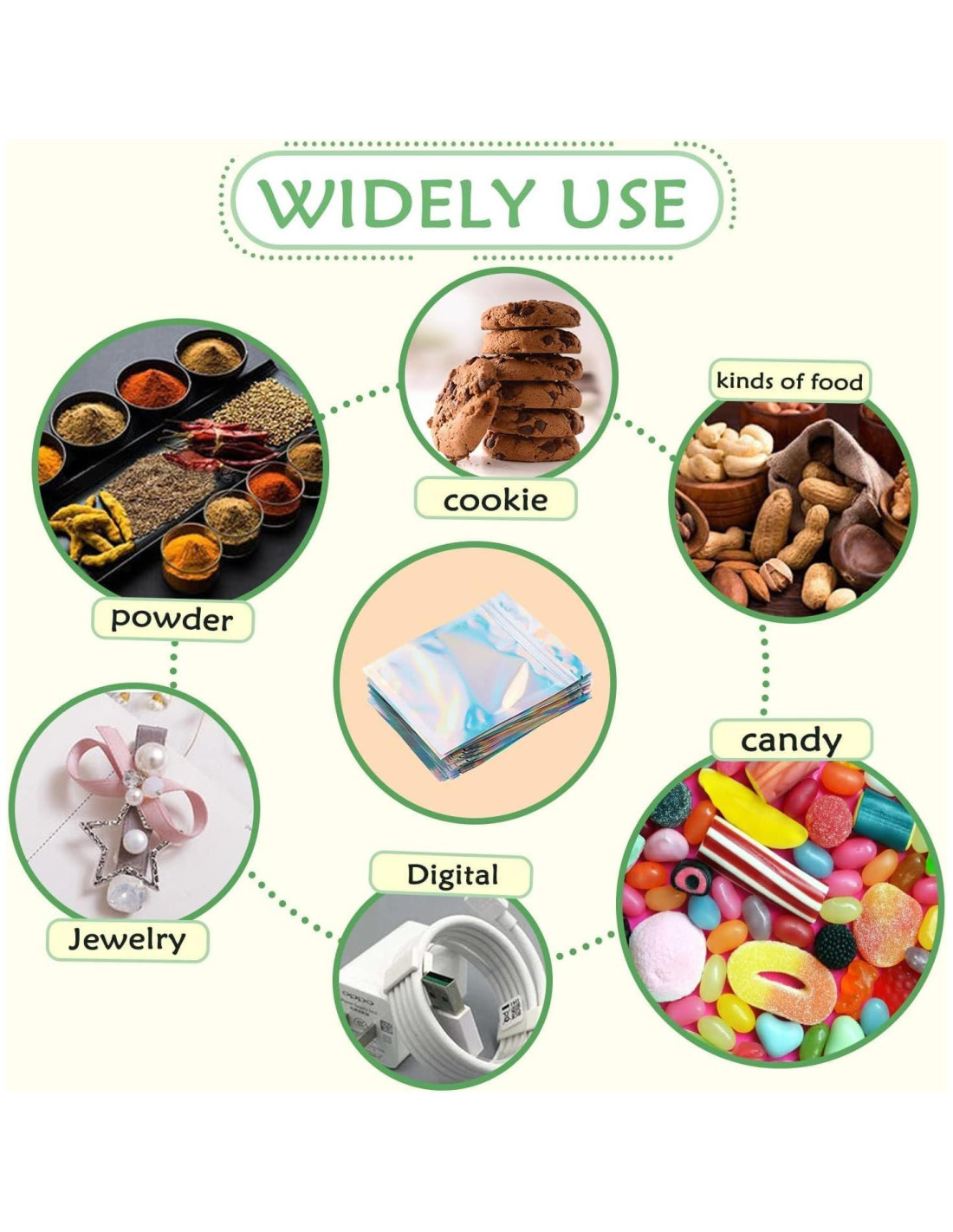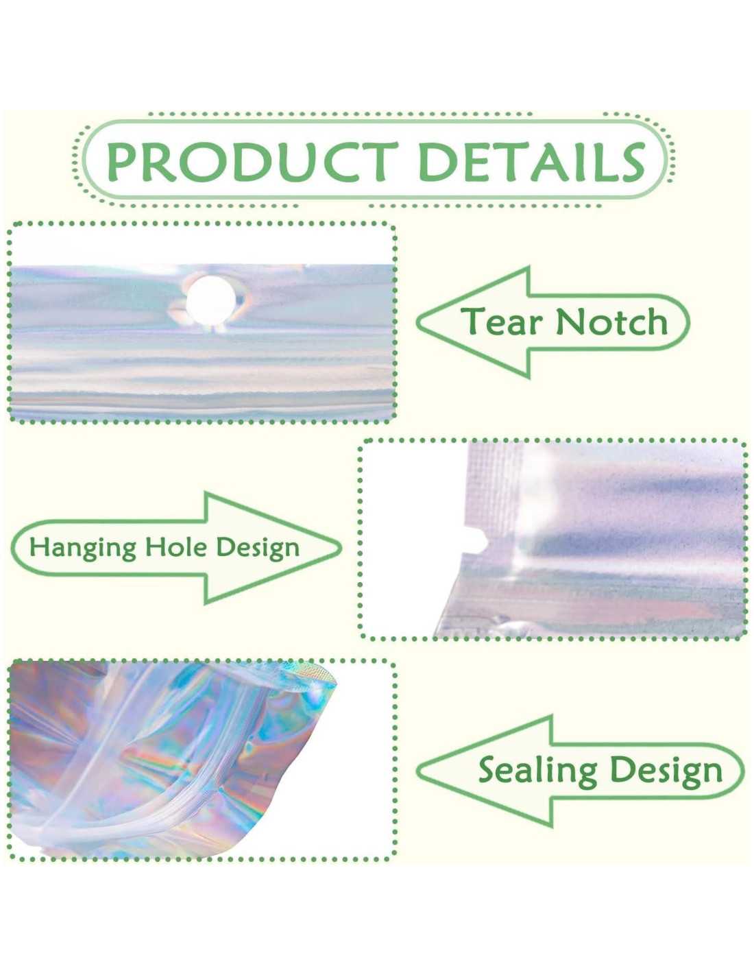 - [Bolsas Holográficas con Ventana Transparente] Las brillantes bolsas holográficas resistentes a olores están hechas de materiales de alta calidad y muestran hermosos colores arcoíris cuando la luz se refracta. Presentando colores arcoíris holográficos y frente transparente para una clara exhibición del producto.