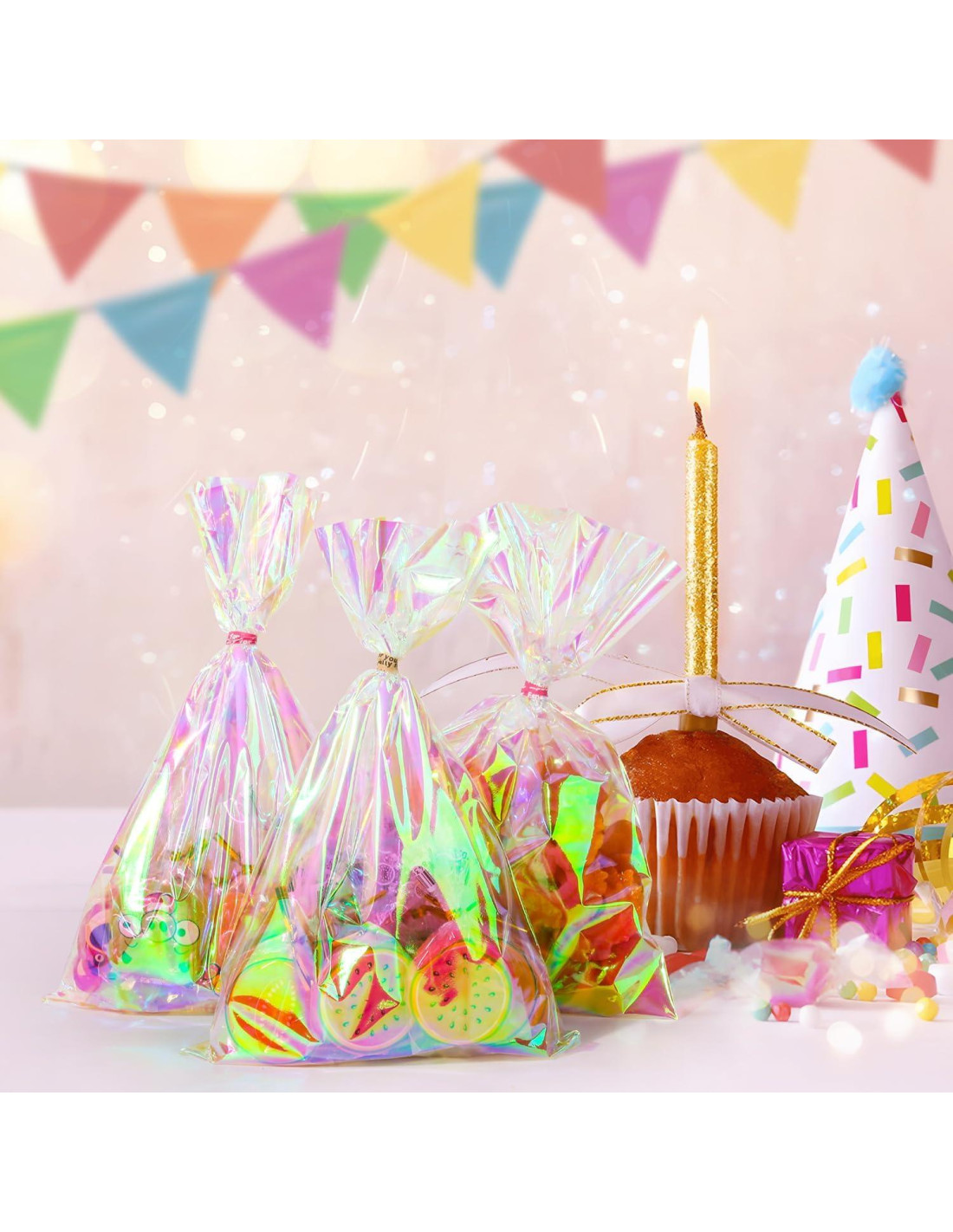 - 5. Duraderas y Llamativas: Fabricadas con plástico duradero, estas bolsas de celofán no solo aseguran la frescura y el atractivo visual de tus dulces y regalos, sino que también cautivan con su diseño holográfico iridiscente, creando una experiencia memorable y encantadora para los destinatarios.