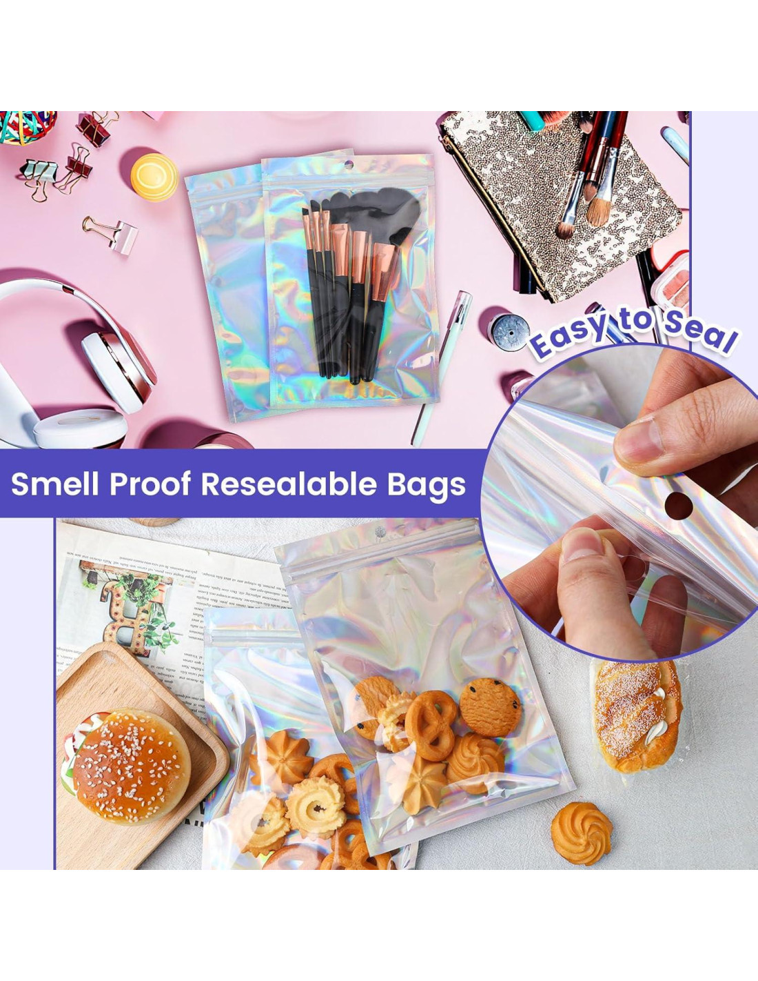 - El paquete incluye - Recibirás 15 bolsas holográficas reutilizables. Estas bolsas de aluminio cuentan con una tira autoadhesiva diseñada para mantener tus artículos limpios, seguros y organizados.