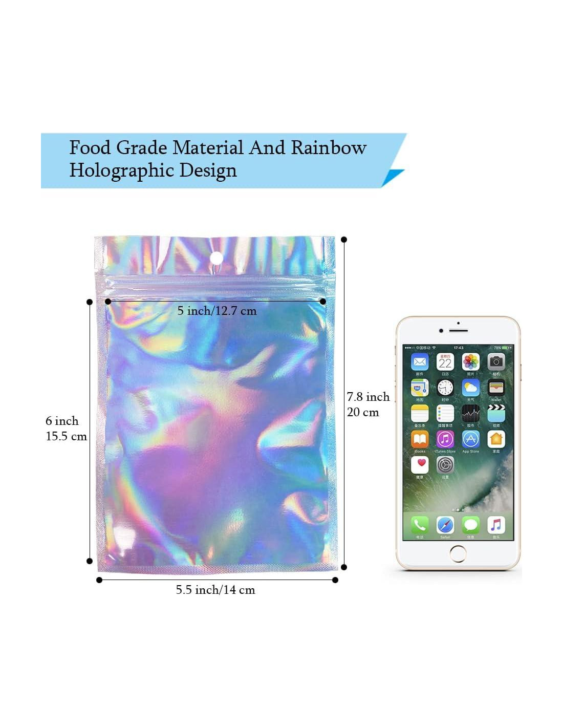 - Bolsas Planas Holográficas Brillantes - 50pcs bolsas holográficas con cierre están hechas de PET y aluminio, material de grado alimenticio y diseño holográfico brillante de arcoíris para decorar tu bocadillo, joyería, muestra de maquillaje y dejar una impresión memorable