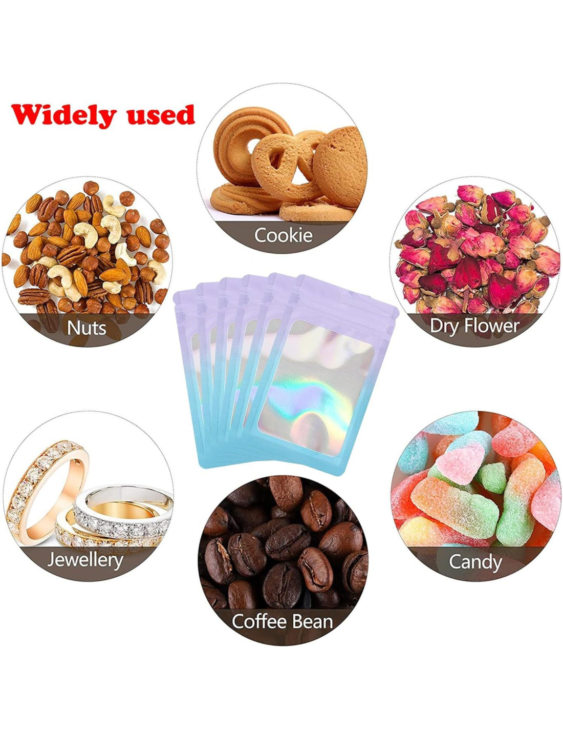 - [Nuevas Bolsas Holográficas] - El diseño de ventana clara muestra claramente lo que ha empaquetado en la bolsa, más fácil de encontrar lo que desea. El bonito aspecto degradado hace que su contenido sea más atractivo, adecuado para favores de fiesta y para pequeños negocios para exhibir muestras, pestañas, brillo labial, uñas. Nuevas bolsas holográficas elegantes, un buen diseño sólido hace que su artículo de empaque se destaque.
