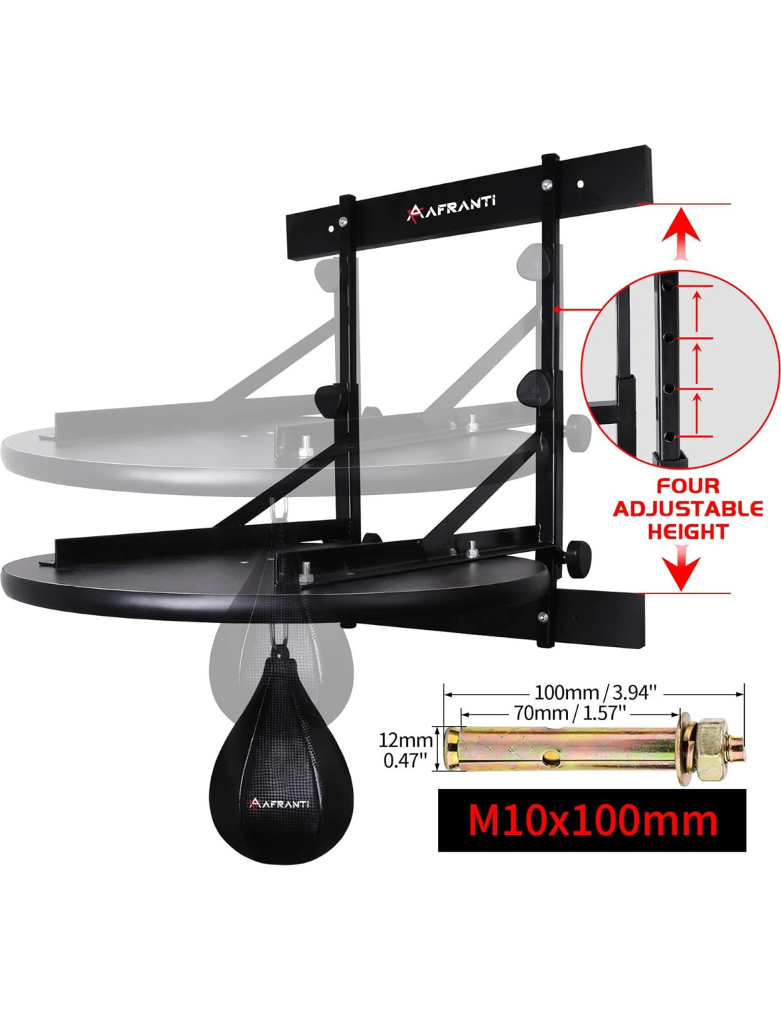 Kit de plataforma de bolsa de velocidad ajustable de 4 niveles AFRANTI con bola de velocidad. 4 tornillos de expansión incluidos para fijar el marco en la pared. La plataforma está soportada por material de acero de alta resistencia, y no hay duda de que puede soportar todo el entrenamiento intenso de boxeo. La plataforma de madera de alta calidad y el cojinete profesional pueden reducir la vibración durante el movimiento y así reducir el ruido. La altura ajustable de 4 niveles puede satisfacer las necesidades de todo tipo de personas, desde principiantes hasta atletas profesionales. NO usar en paredes huecas, instalar solo en paredes SÓLIDAS.