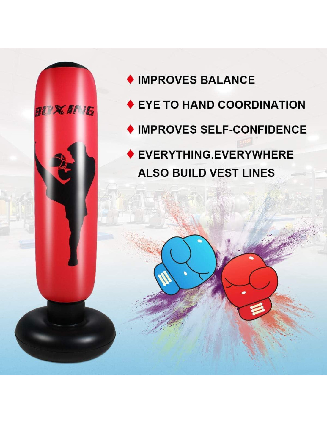 - [Alta Calidad] : El saco de boxeo inflable para jóvenes es muy fácil de instalar y es independiente para su conveniencia. Está fabricado a la perfección con el mejor vinilo de calidad que es fuerte y suave, por lo que no lastimará los nudillos de su hijo.