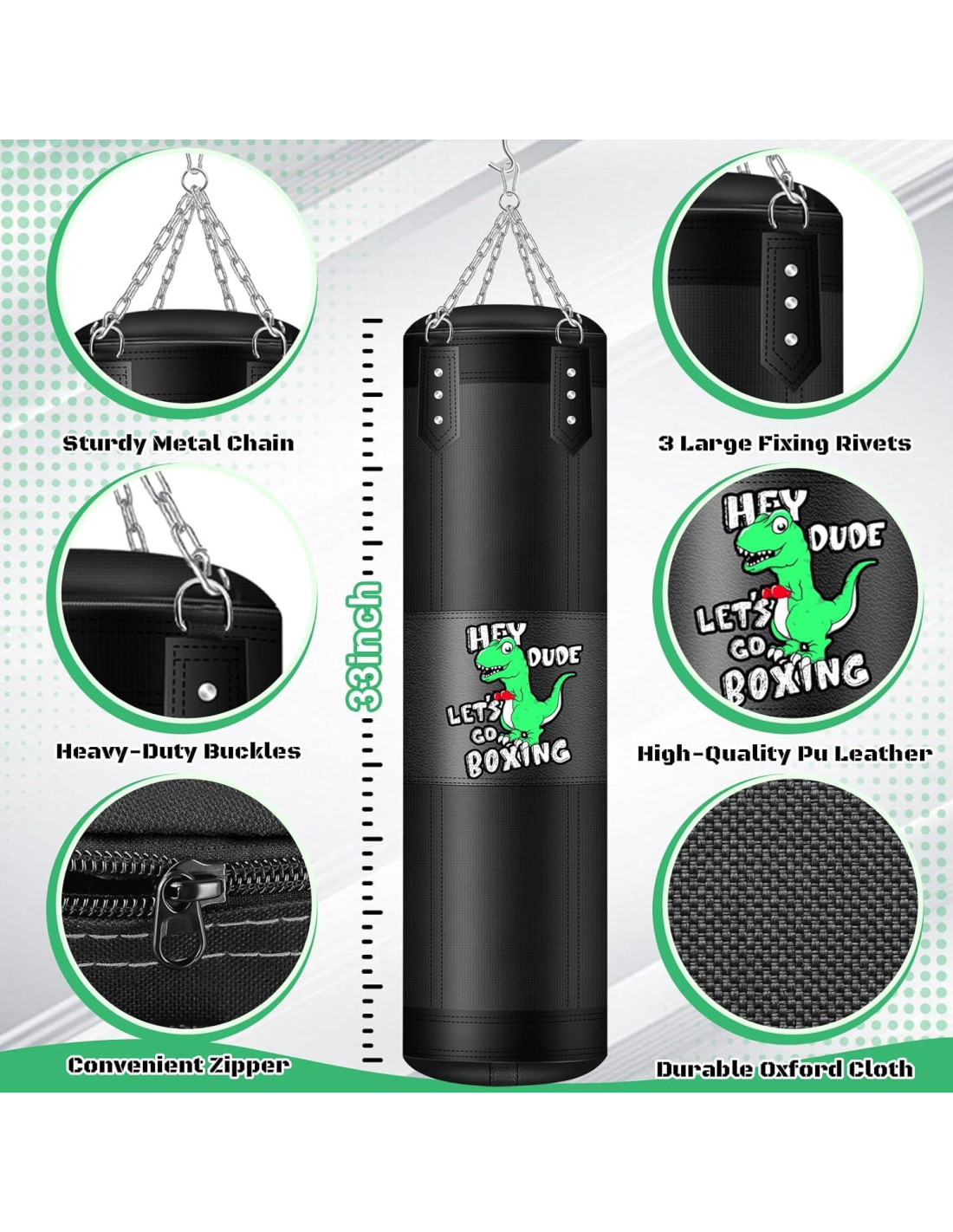 - Componentes incluidos: saco de boxeo para niños de 2.7 pies, bolsa de esponja de 2KG, guantes de boxeo de 6 oz, cadena colgante, gancho de expansión, mosquetón de conexión