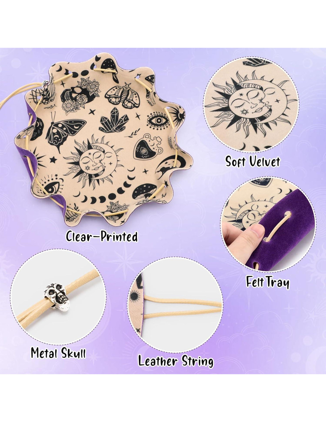 - DISEÑO DE PATRONES MÍSTICOS - Nuestra bandeja de dados presenta patrones encantadores, incluyendo el sol y la luna, polilla, cristal, hongo, ojo maligno y fase lunar. Estos diseños cautivadores seguramente sumergirán a los jugadores en un mundo de magia, elevando su experiencia de juego a nuevas alturas.