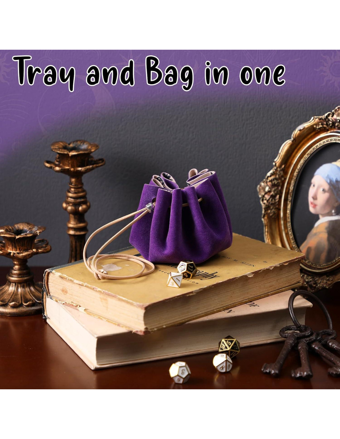 - BANDEJA Y BOLSA EN UNO - La bolsa de dados se despliega a un tamaño de 24.6 cm (9.7 pulgadas), acomodando una amplia gama de necesidades de juego. Con un cordón de cuero y un tope de calavera de metal, puede transformar fácilmente la bandeja en una bolsa de almacenamiento segura y compacta. Simplemente reúna sus dados y accesorios de juego, tire del cordón y disfrute de la conveniencia de una solución de almacenamiento portátil.