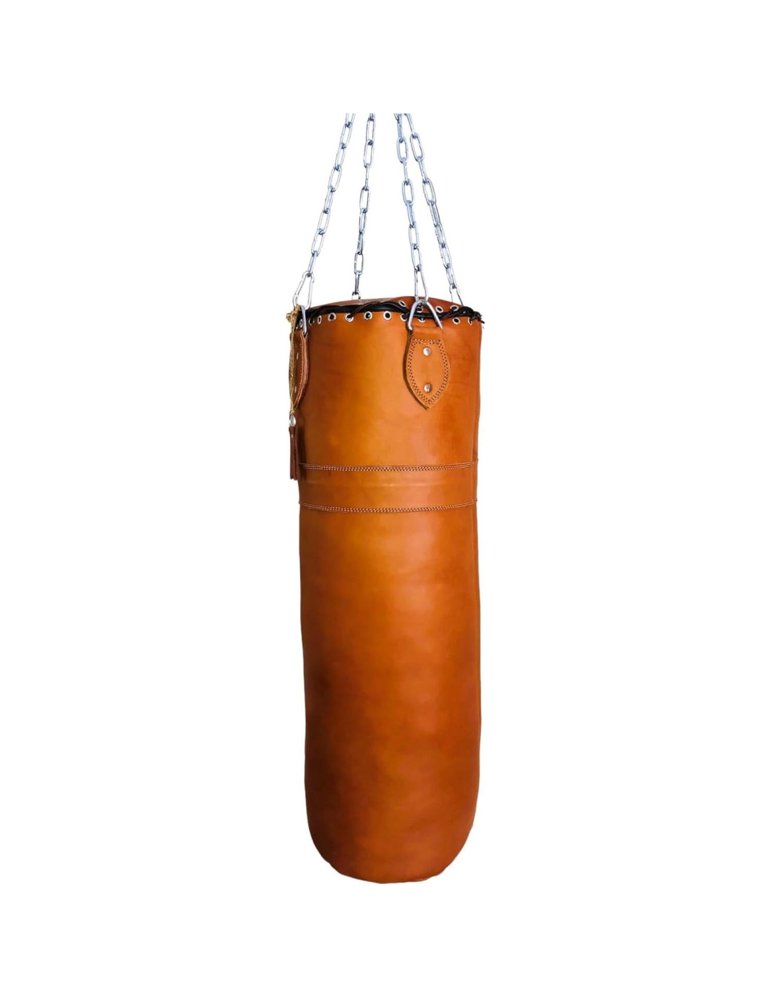 Bolsa de Boxeo de Cuero Vintage Color Tan con Cadenas. Bolsa de boxeo de estilo vintage. Es de color tan vintage. 100% cuero de vaca. Se suministra sin rellenar. 100 cm de longitud sin cadenas y 90 cm de circunferencia (medidas rellenas). Cadenas de acero sólido tradicionales y gancho giratorio. Un artículo ideal para coleccionistas ya que está en muy buenas condiciones. Aspecto retro antiguo pero recién hecho y todo cosido a mano. Acabado encerado para un aspecto retro antiguo. Puedes rellenarla fácilmente con aserrín, arena o desechos de sastre. PAR DE GUANTES DE MMA GRATIS.