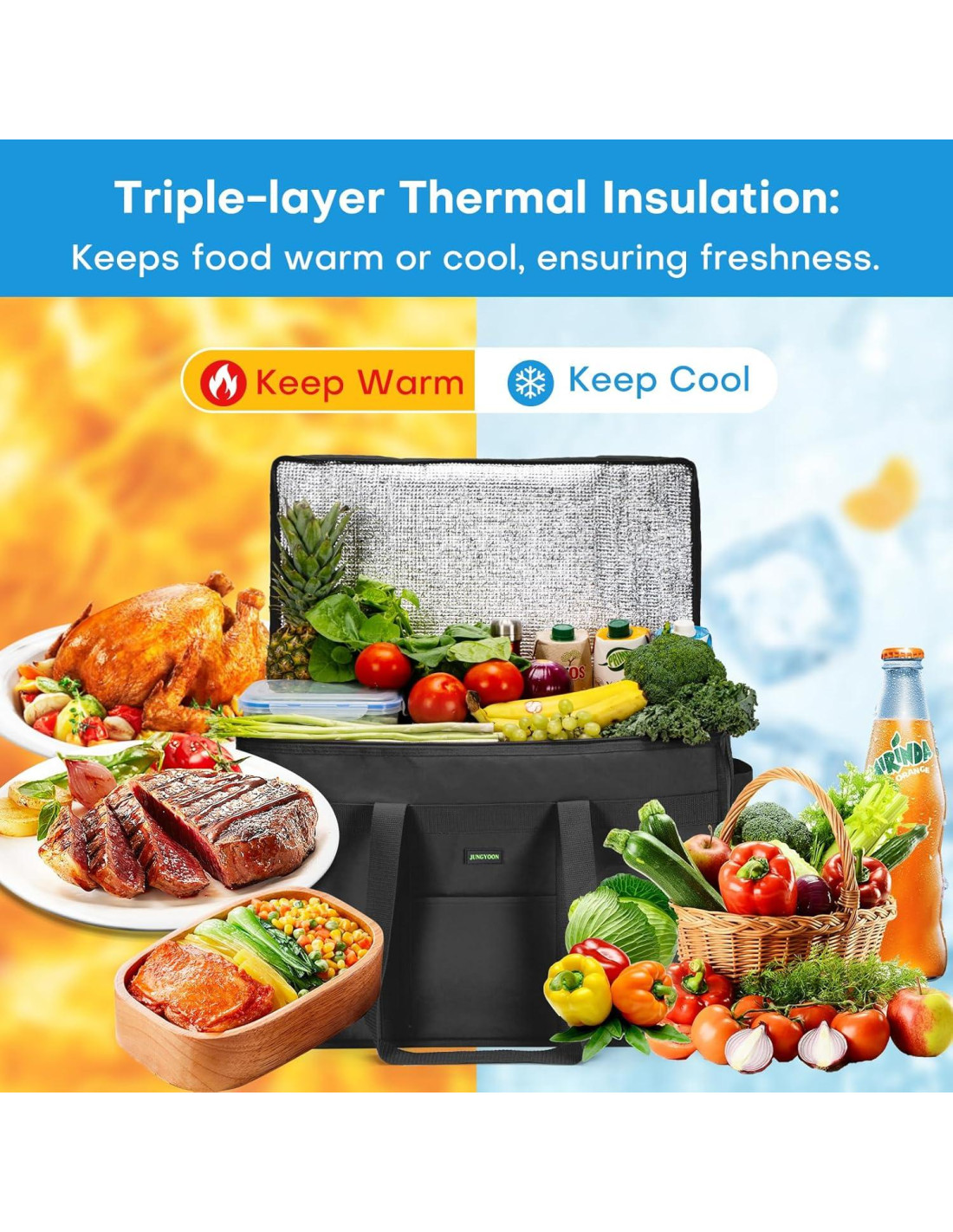 - Gran capacidad: Dimensiones de las bolsas de compras aisladas, bolsa enfriadora 40.6 cm de ancho x 31.8 cm de alto x 22.9 cm de profundidad (Capacidad; 27L*2), es lo suficientemente grande para contener muchas compras al ir de compras en el supermercado o mercado de agricultores, llevar múltiples pedidos al entregar alimentos, o servir mucha comida para picnics, campamentos, cenas, días de playa, fiestas, cenas o reuniones. Puede contener fácilmente 27.3 litros*2.