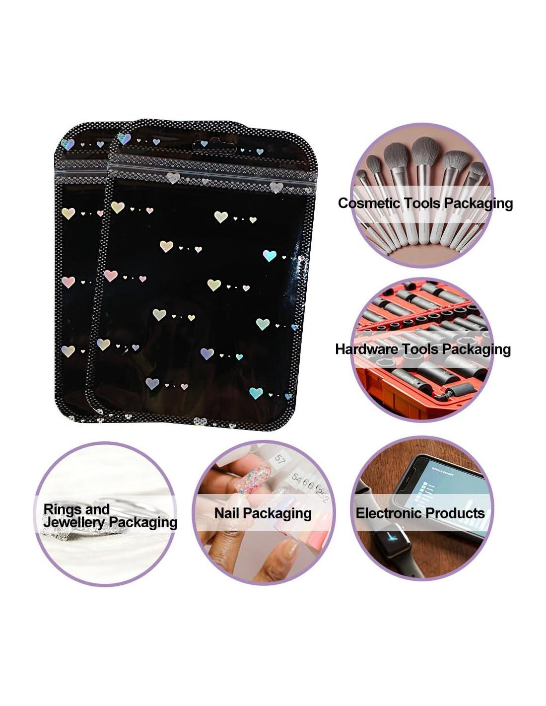 - [Hermosas y Convenientes]: Hay una ventana clara en la parte frontal de estas bolsas de mylar negras, lo que facilita identificar rápidamente los artículos internos. El diseño del agujero para colgar de las bolsas de mylar reutilizables puede hacer que las bolsas de almacenamiento de alimentos sean convenientes para colgar y exhibir estas pequeñas bolsas de mylar, aumentando su valor ornamental. Con un patrón en forma de corazón y diseño holográfico, cuando se exhiben en interiores, no necesitas mucha iluminación para ver el hermoso color.