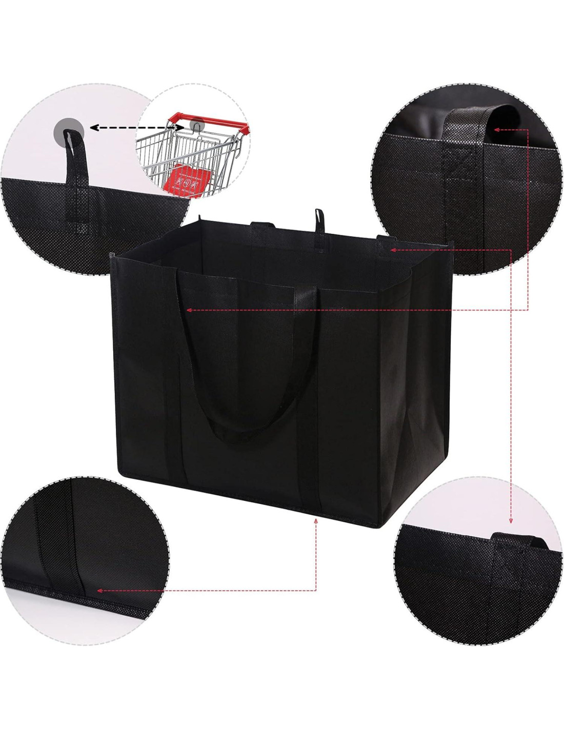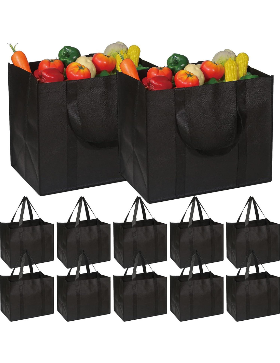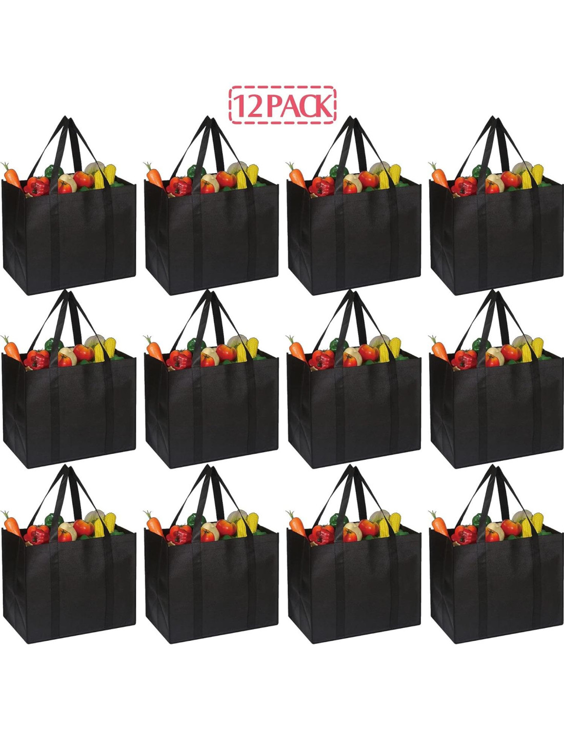 - Gran Capacidad: 40.9 cm de ancho, 33 cm de alto con 25.9 cm de fondo plano. Conjunto de 12, Negro. El tamaño de la bolsa de compras para viajes familiares al supermercado. Adecuado para compras, ropa, verduras, frutas, viajes, artículos voluminosos.