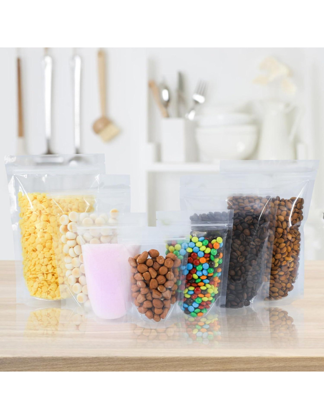 - Cantidad y Material: El paquete incluye 100 PCS Bolsas transparentes de pie. Hechas de plástico de grado alimenticio, que es inodoro, reutilizable e impermeable, mantiene la frescura de tus productos