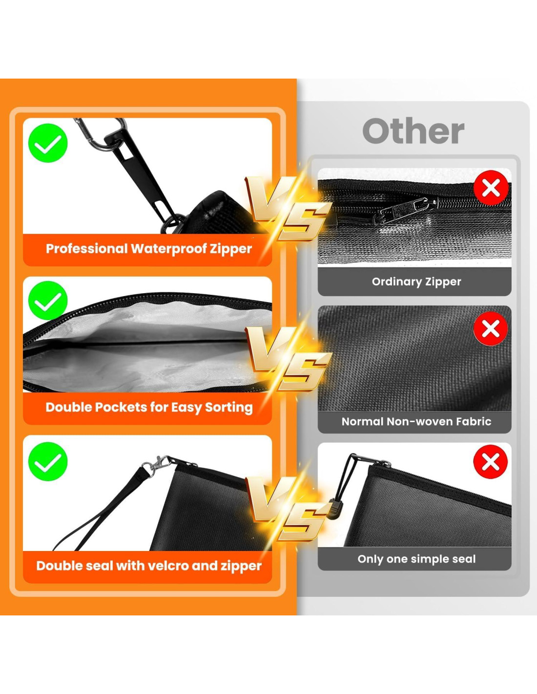 - Superior Resistente al Agua: La mayoría de las bolsas ignífugas para documentos en el mercado tienen un espacio de 1 a 2 mm en la cremallera. El espacio probablemente permitiría que el agua entrara. Nuestra bolsa ignífuga para dinero tiene una tapa al final de la cremallera que puede prevenir efectivamente el agua. Las cremalleras selladas son totalmente impermeables y pueden sobrevivir al rociado de la manguera de los bomberos a máxima presión, proporcionando un sello de seguridad y máxima protección.