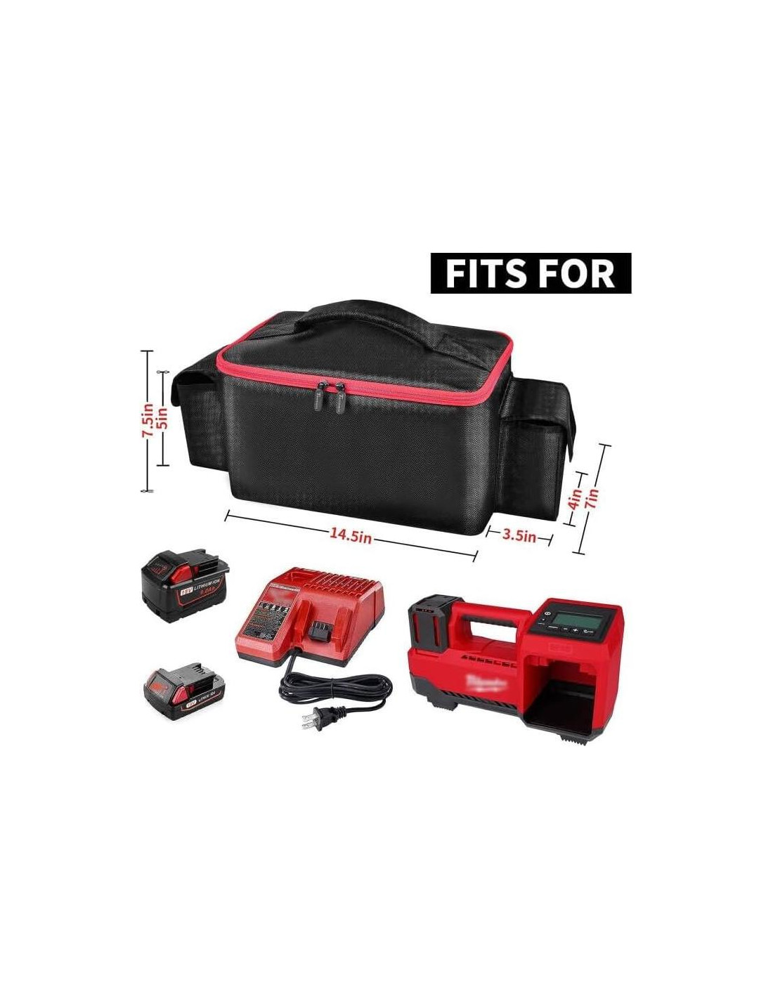 - Ajuste exacto: la bolsa de inflador de neumáticos está especialmente diseñada para el inflador Milwaukee M18. Para la bolsa de herramientas Milwaukee en ambos lados para almacenar batería de repuesto adicional de 3.0/4.0/5.0/6.0/6.5/7.0/8.0/9.0Ah. Para la caja de herramientas Milwaukee asegura que las herramientas Milwaukee M18 y la bolsa de compresor de aire portátil encajen de manera segura, lo que puede mantener el inflador de neumáticos inalámbrico en un estado estable y cómodo. Dimensiones generales: 36.8 x 17.8 x 19.1 cm; Dimensiones de los bolsillos laterales: 8.9 x 10.2 x 12.7 cm. (Solo bolsa, excluyendo Milwaukee M18 y batería)