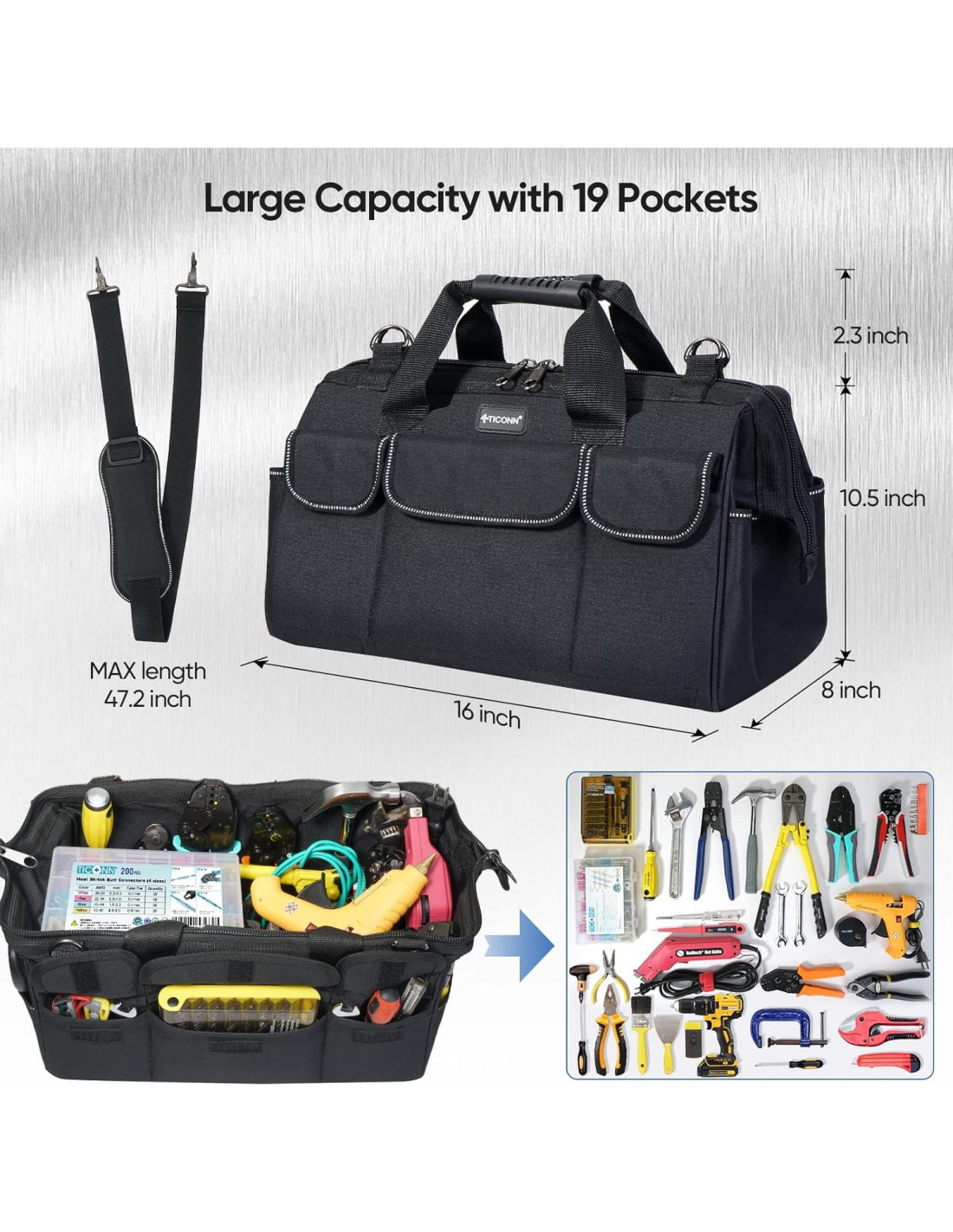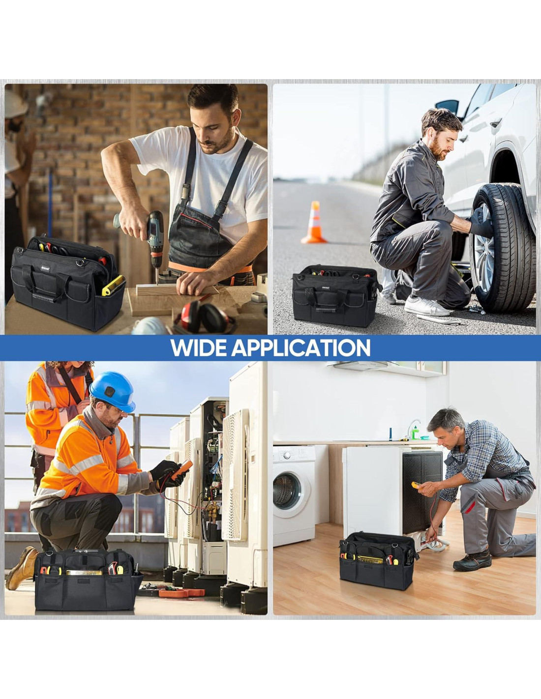 - [PRÁCTICA Y FUNCIONAL] La apertura de boca ancha facilita la carga de herramientas más grandes. 8 bolsillos laterales en el exterior te dan fácil acceso a las herramientas pequeñas que más necesitas. La base hace que el fondo de la bolsa sea impermeable y resistente a la abrasión. También ayuda a mantener la forma de este tote de almacenamiento de herramientas.