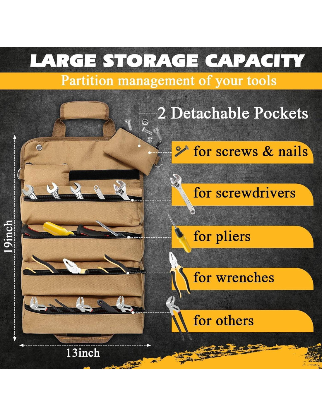 - Herramienta de gran capacidad: esta bolsa de herramientas enrollable tiene 4 compartimentos grandes para herramientas y 2 bolsas de herramientas desmontables con lazos - una característica única en esta bolsa de herramientas para mecánicos; El diseño enrollable permite un almacenamiento y transporte convenientes de tus herramientas