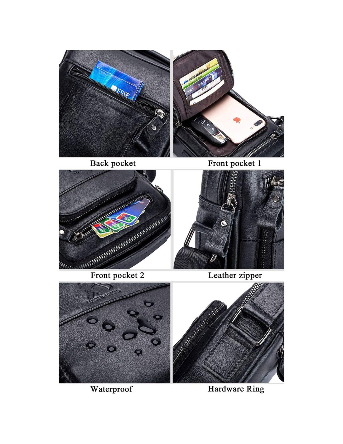 - Múltiples bolsillos: La bolsa mensajera pequeña de cuero para hombres tiene un total de 6 bolsillos. Hay dos bolsillos frontales, uno de los cuales contiene ranuras para tarjetas. El bolsillo principal de la pequeña bolsa de mano para hombres contiene un bolsillo con cremallera en el interior y un bolsillo abierto. El bolsillo con cremallera en la parte posterior de la bolsa de cuero para hombres es para fines antirrobo.