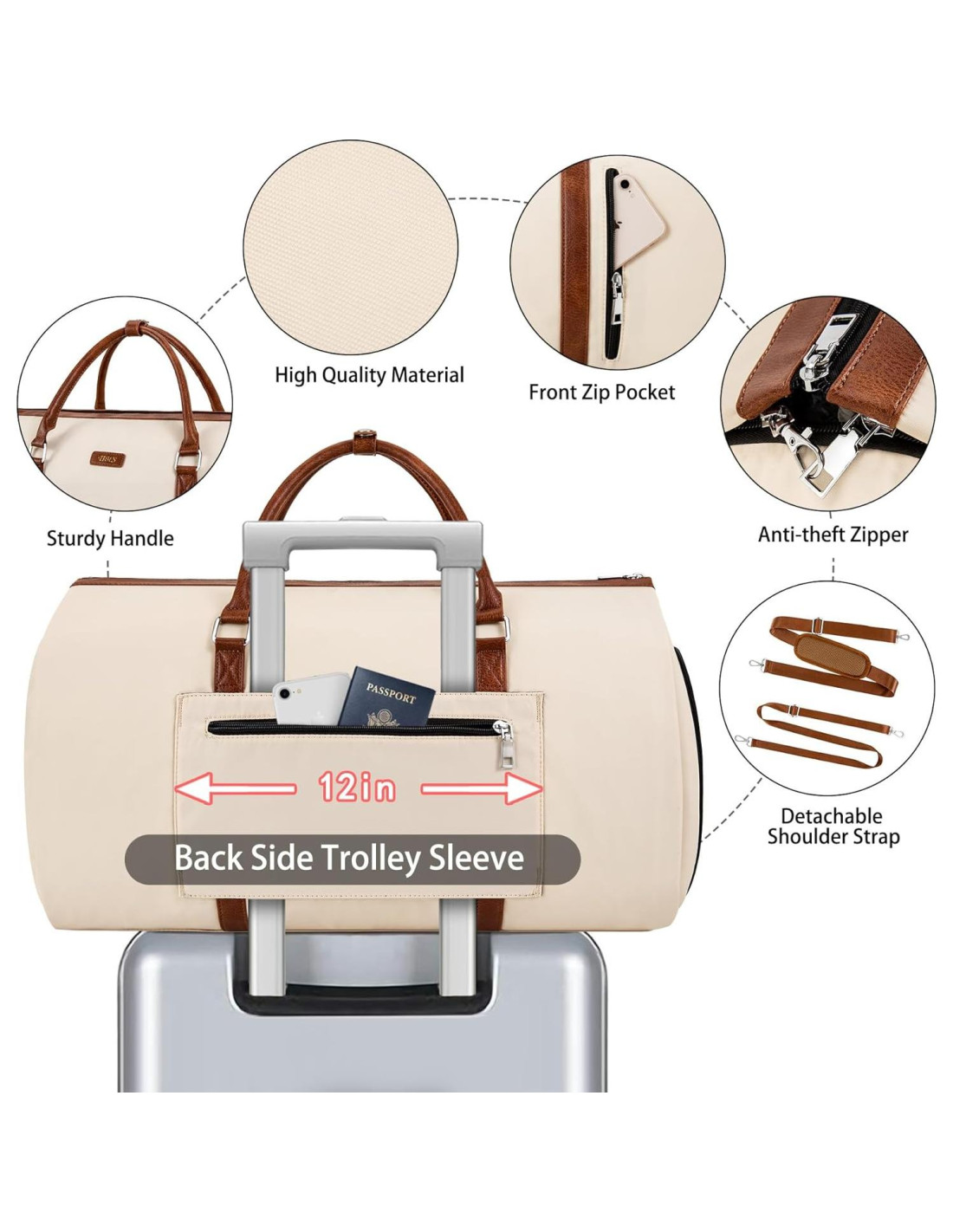 - Bolsa de viaje para ropa con funda para maleta: La funda en la parte posterior permite deslizar fácilmente tu bolsa sobre el mango de tu maleta, haciéndola más conveniente y cómoda de transportar. También hay un bolsillo con cremallera para guardar tu teléfono inteligente, identificaciones o pasaporte que necesitas acceder rápidamente. La bolsa de viaje para ropa viene con múltiples opciones de transporte, lo que te permite cambiar fácilmente entre llevar la bolsa sobre tu hombro o deslizarla sobre tu maleta.