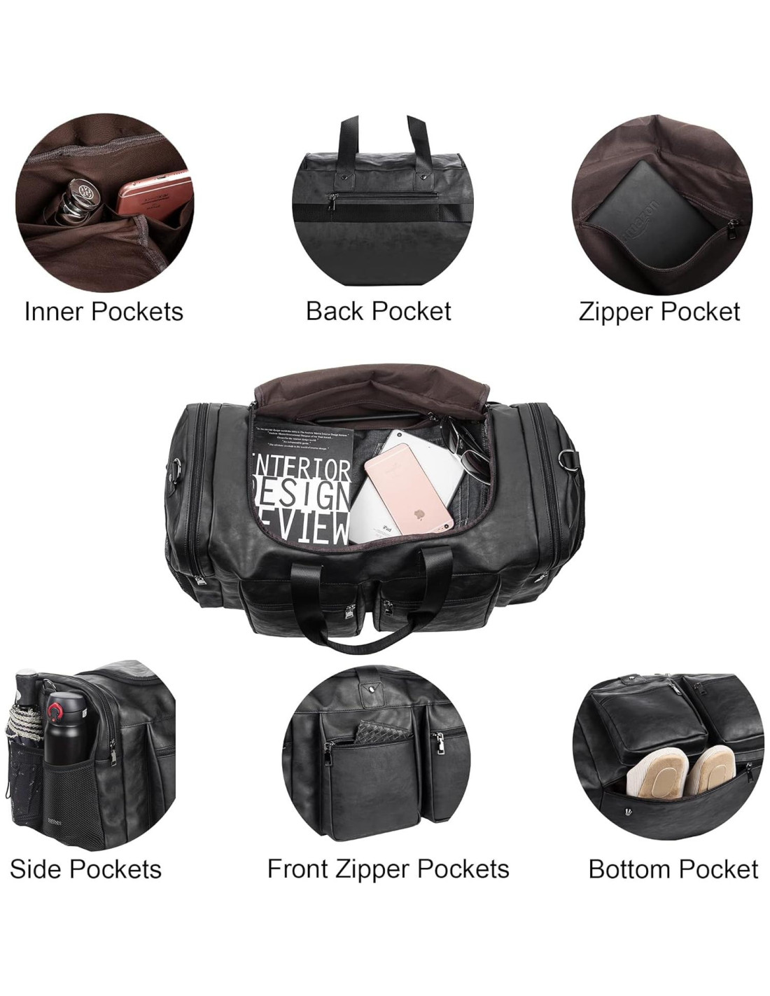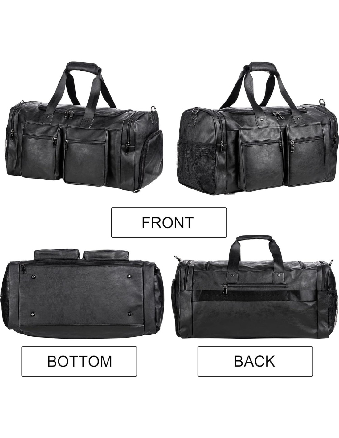 - Bolsa de Duffle Sobredimensionada: Hecha de cuero PU de super fibra impermeable de alta calidad. 56 cm/30.48 cm/26.67 cm (L*W*H). Peso: 1.5 kg (3.3 libras). Gran capacidad sobredimensionada: 52L. Más grande que la bolsa de gimnasio normal, adecuada para 3-4 días de fin de semana o viaje de negocios. Estilo clásico unisex perfecto para hombres y mujeres