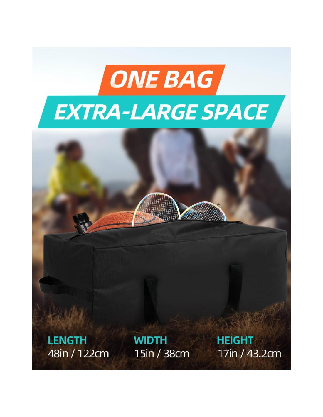 - [Gran Capacidad] La bolsa de deporte mide 48'' x 15'' x 17'' (121.92 cm x 38.1 cm x 43.18 cm) y ofrece un amplio espacio de almacenamiento para una variedad de artículos. Es adecuada para almacenar ropa, artículos diversos, decoraciones navideñas, equipo deportivo, equipo de fotografía y más. Ya sea que necesites deshacerte del desorden en tu hogar, almacenar artículos de temporada o transportar pertenencias, esta bolsa duffle proporciona mucho espacio.