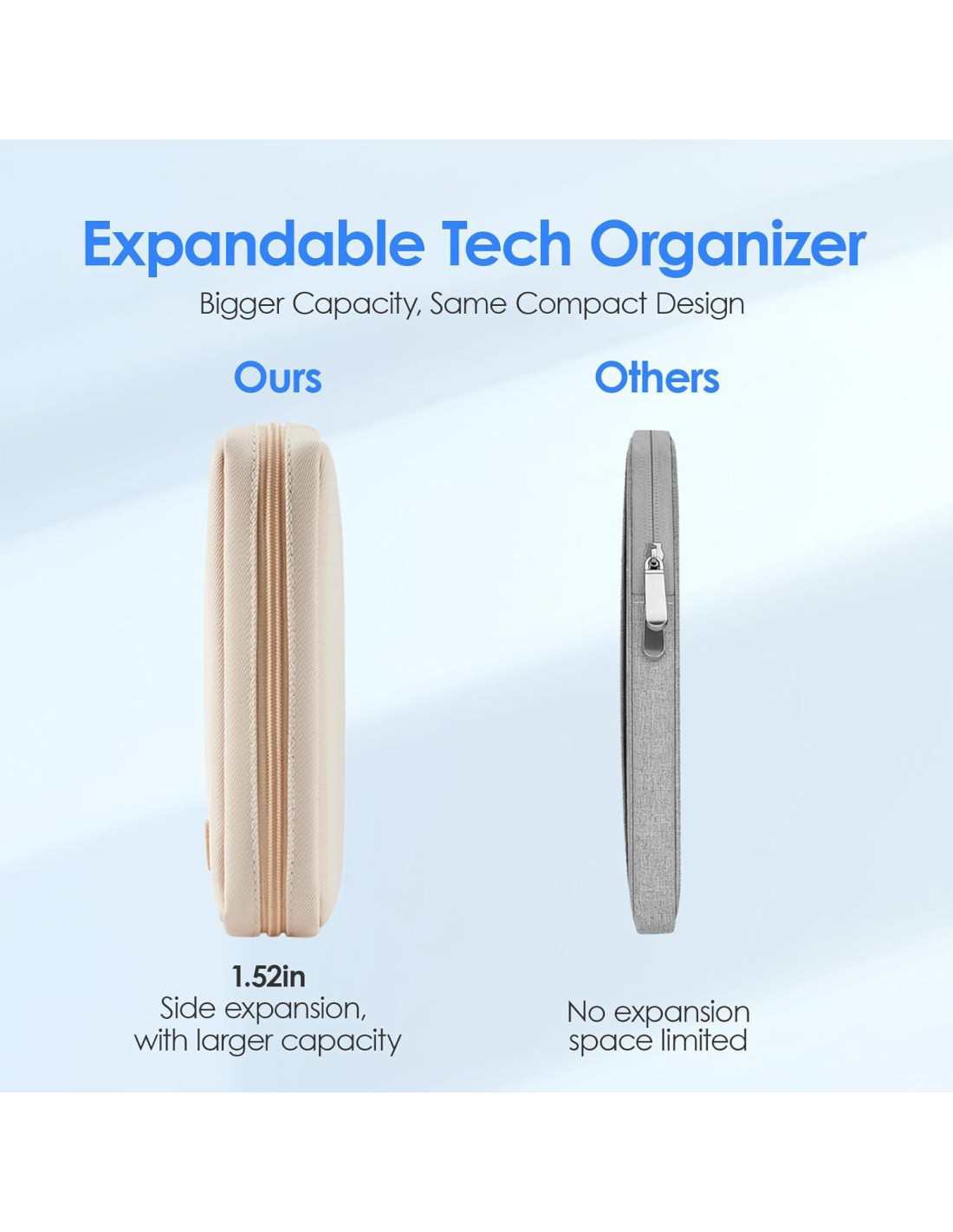 - Capacidad Expandible: Adecuada para cargadores, energía móvil, unidades USB, adaptadores. Además, el interior es expandible para acomodar cables de diferentes longitudes y grosores.