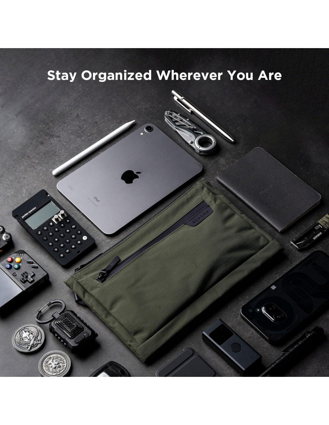 - Soporte Multifuncional para Tecnología, Efectivo y Tarjetas: Los bolsillos con cremallera delanteros y traseros te permiten separar fácilmente tu efectivo y tarjetas de tus esenciales. Dentro de la bolsa, dos bolsillos deslizantes mantienen tus artículos organizados y al alcance. Desde cables hasta bolígrafos o tecnología pequeña, estos bolsillos aseguran que todo tenga un lugar y puedas encontrarlo al instante. Una funda separada puede sostener un artículo delgado como un iPad Mini y la sección media expandible está diseñada para artículos más voluminosos.